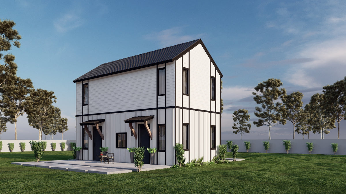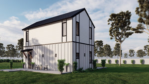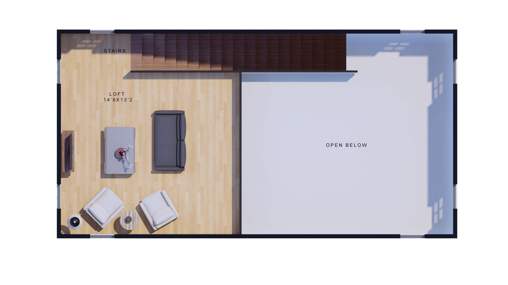 Upstairs, the 225 sq. ft. second floor includes a loft with a balcony, offering additional living space that can serve as a reading nook, lounge, or guest area. With a slab foundation, 2x4 wall framing, and stick-built roofing featuring an 8:12 roof pitch, this ADU is designed for durability and efficiency. The 10-foot first-floor ceilings enhance the sense of openness, while the 8-foot second-floor ceilings create a cozy yet functional feel. Measuring 32'6" wide by 17'0" deep, this ADU is compact yet spacious, making it a perfect addition to an existing property.