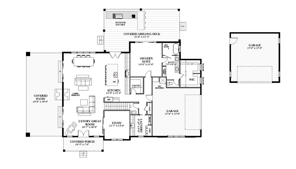This stunning 3,399 sq ft Barndominium-style home delivers the perfect blend of rustic charm and modern convenience, designed for open living, practical space, and bold architectural character. With a dramatic two-story grand room, this home makes a statement from the moment you step inside. The open-concept kitchen features a large island, walk-in pantry, and direct access to a grilling terrace and expansive covered patio ideal for indoor-outdoor entertaining. A private first-floor master suite offers a spa-like bath and dual walk-in closets, while a dedicated home office and laundry room add smart functionality.