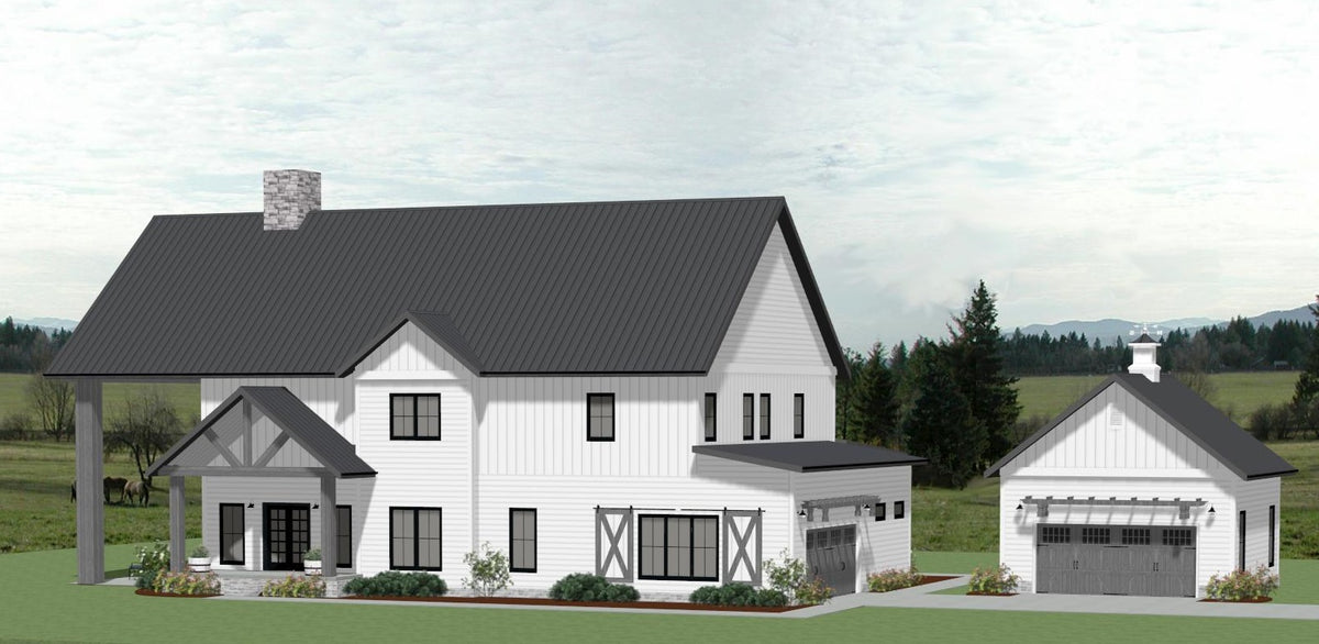 The second floor opens to a spacious loft overlooking the great room, creating a unique sense of openness and flexibility. Three additional bedrooms and two full baths provide ample room for family or guests. With a total of four garage bays—two attached and two detached—this layout is perfect for car collectors, hobbyists, or anyone needing serious storage. Topped with over 1,250 sq ft of outdoor living space, this barndominium style home pairs rugged appeal with elegant comfort for a lifestyle that’s both relaxed and refined.