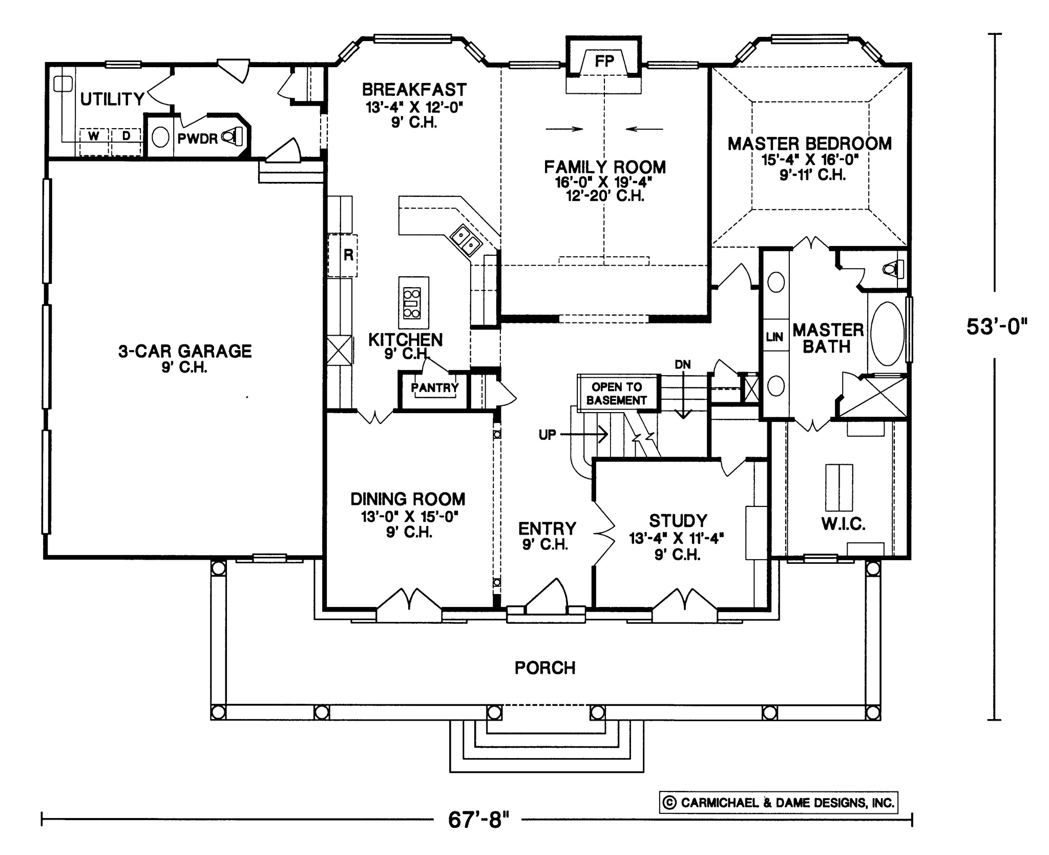 Upstairs, three secondary bedrooms are clustered around a shared bath, offering privacy and easy access. With 9-foot ceilings on the main level and 8-foot ceilings upstairs, the home feels open and airy throughout. A covered front porch, expansive deck, and side-load three-car garage enhance the home’s curb appeal and usability. Built on a slab foundation with 2x4 framing, and measuring 67'8" wide by 53' deep, this design delivers comfort, flexibility, and lasting value in a timeless layout.