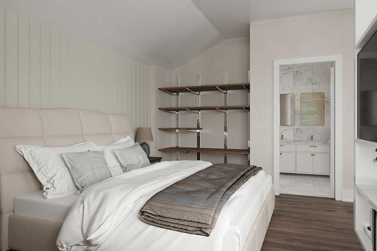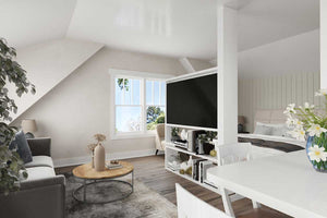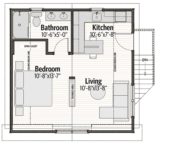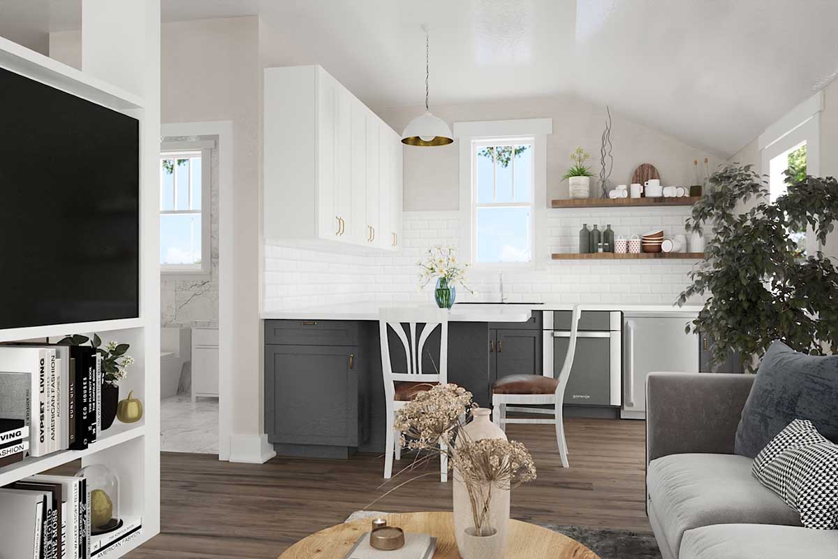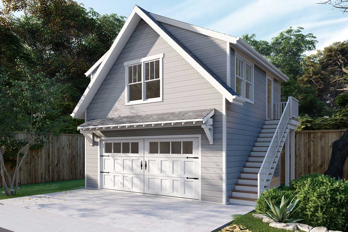 This 484 sq ft garage apartment is a compact, stylish solution for homeowners needing additional living space without expanding their home's footprint. Situated above a 2-car garage, the second-floor living quarters include a comfortable bedroom and bathroom, all within a well-designed open floor plan that maximizes space and natural light.