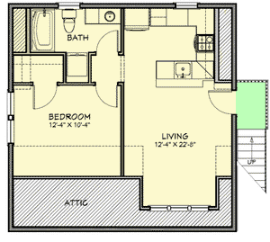 Designed with smart living in mind, this 26' x 26' structure fits comfortably on most properties while maximizing vertical space with 9' ceilings in the garage and 8' ceilings in the living quarters. The steep 10.5:12 roof pitch adds architectural interest, while the slab foundation ensures long-term stability and ease of construction. Whether used as an accessory dwelling unit (ADU), guest house, or income-generating rental, this plan is a practical and attractive addition to any home.