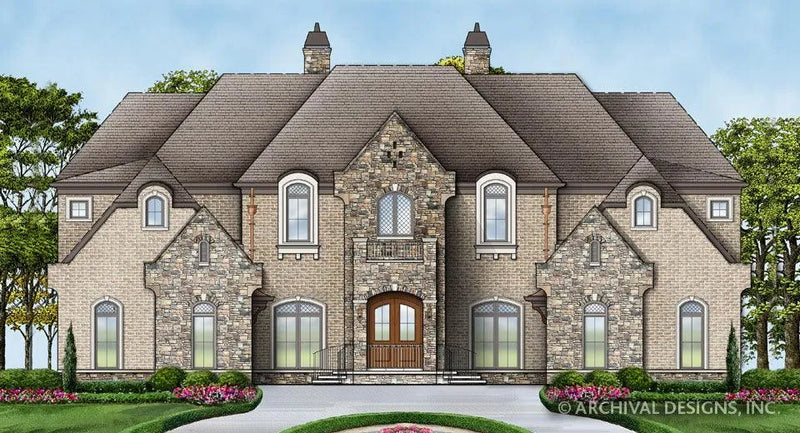 The Alexandra beautifully blends European and French architecture with the modern amenities every family demands today. Arched wall dormers and the luxurious stone covered porch give this symmetrical mansion house plan undeniable charm.