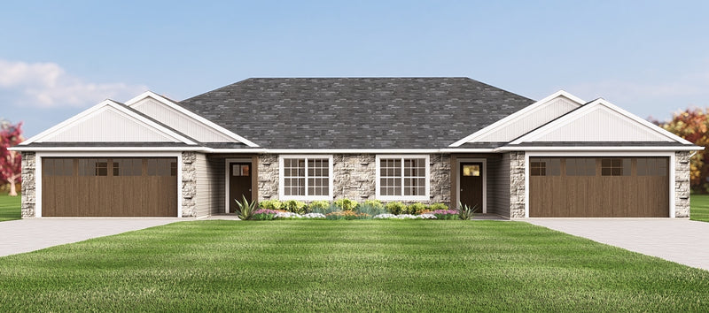 • This duplex house plan boasts a total living area of 2,762 sq ft, featuring a generous first floor where all the key living spaces come together harmoniously measuring 1,381 sq ft on each unit. The home includes two well-appointed bedrooms and two bathrooms per unit, providing ample space for family and guests. The 50 sq ft porch on each unit adds a welcoming touch, perfect for relaxing outdoors, while the expansive 431 sq ft garage per unit accommodates up to two vehicles each with a convenient front load design. The structure rests on a sturdy slab foundation, enhancing stability and comfort. Constructed with robust 2x6 wall framing and a durable truss roof, the home features a pleasing 6:12 roof pitch that contributes to its appealing aesthetics. The house measures 76 feet in width and 52 feet in depth, reaching a building height of 19 feet, 7 inches, ensuring a spacious interior. The first floor boasts an impressive 8-foot ceiling height, enhancing the open and airy feel throughout. Key features include a cluster bedroom design, a first-floor laundry for convenience, and a master suite on the main level, making this the perfect choice for modern living.