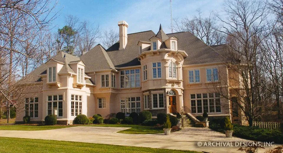 A round turret atop arched windows presents a unique exterior for this luxury house plan. The grand foyer of the Amboise house opens through palatial double doors. This leads to one of the home plans' most spectacular characteristics, an extraordinary staircase. Beyond the foyer, the great room features an ornate vaulted ceiling and two-story windows with view to the stunning outdoors.