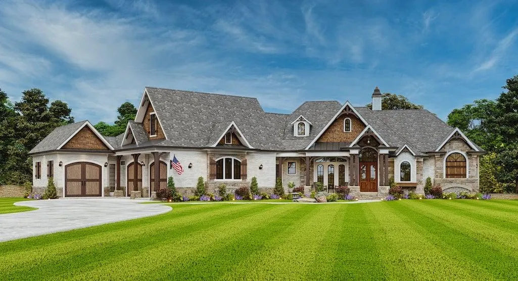 This craftsman house plan boasts a spacious open floor plan that seamlessly connects the main living areas. This design promotes a sense of flow and allows for easy interaction between the kitchen, dining room, and living room. The plan includes a first-floor master suite, offering convenience and privacy for the homeowners. This retreat-like space may feature a luxurious ensuite bathroom and a walk-in closet, providing comfort and relaxation. The plan embraces outdoor living with its charming covered porch or deck. This outdoor space is perfect for entertaining guests or enjoying the natural surroundings, extending the living area beyond the interior walls.