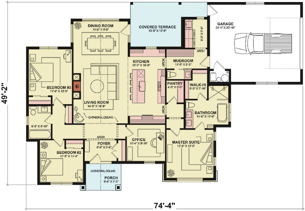 With a width of 74'4", a depth of 49'2", and an 18' building height, this home is framed with durable 2x6 walls and rests on a slab foundation. The 569 sq. ft. garage provides ample storage and parking space.
