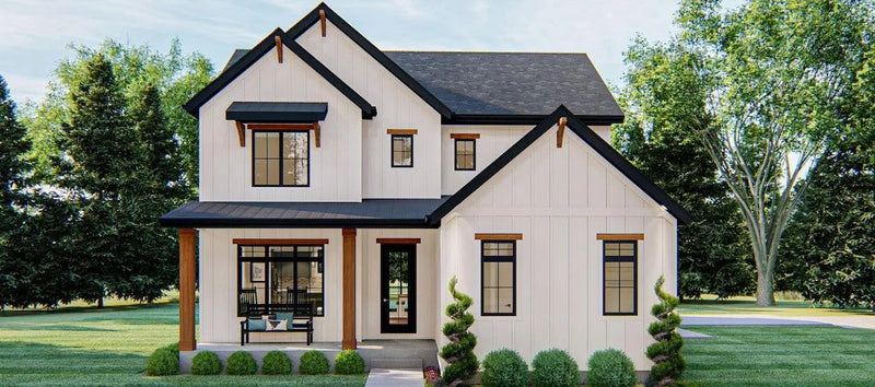Our Applewood plan is a gorgeous Modern Farmhouse plan that is packed with amenities and hidden features. The exterior of the home combines board and batten siding with wood elements and metal roof accents to give this house that Modern Farmhouse curb appeal. Inside the home, you'll love the wide-open floor plan on the main level. The kitchen includes a large island with a snack bar. The master suite is conveniently located on the main floor as well and includes a massive walk-in closet with a built-in shoe rack.