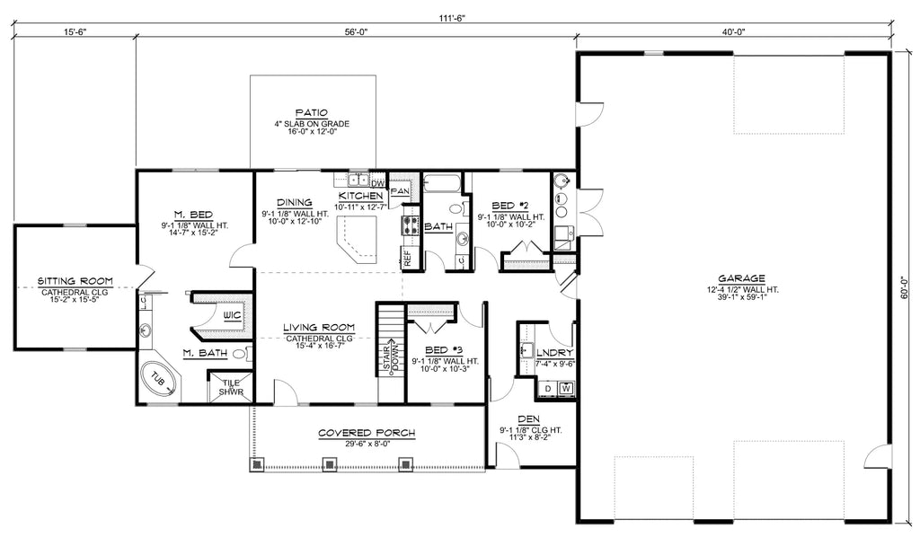 This 2,024 sq. ft. single-story home features a modern design with 3 bedrooms and 2 bathrooms in a split-bedroom layout. The owner's suite includes a sitting area, walk-in closet, and en suite bathroom. The open-concept living area connects the kitchen with a walk-in pantry to the dining and living spaces, making it ideal for family living and entertaining. Key features include a first-floor laundry, covered front porch (223 sq. ft.), and a massive 2,400 sq. ft. three-bay garage with workshop space. The house is built on a slab foundation with 2x6 wall framing and truss roof framing. The home's dimensions are 111'6" wide and 60' deep, with a 9-foot ceiling height on the first floor and an overall building height of 21'3".