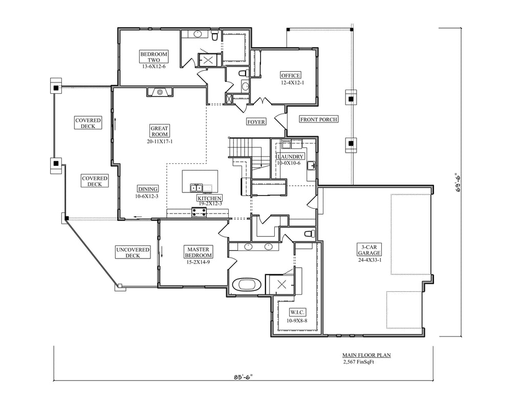 Say hello to this 2,567 sq. ft. home offers 3 bedrooms and 2.5 bathrooms, with a first-floor owner's suite, open floor plan, and a 10-foot ceiling height on both the first floor and basement. Key features include a great room with a fireplace, a kitchen with an island, walk-in pantry, butler’s pantry, and an eating bar. The home includes a game room, media room, home office, hidden room, and first-floor laundry. The house has 973 sq. ft. of covered porch space (front and back), an 834 sq. ft. three-bay front-load garage, and a 1,940 sq. ft. unfinished basement. Built on a basement foundation with a stone exterior, it has a width of 69'-6" and a depth of 85'-6", with a total building height of 21'-4".