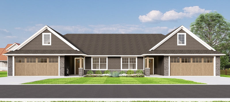 • This multi-family Ranch plan delivers a traditional exterior with gabled rooflines above the double garages and front entries.