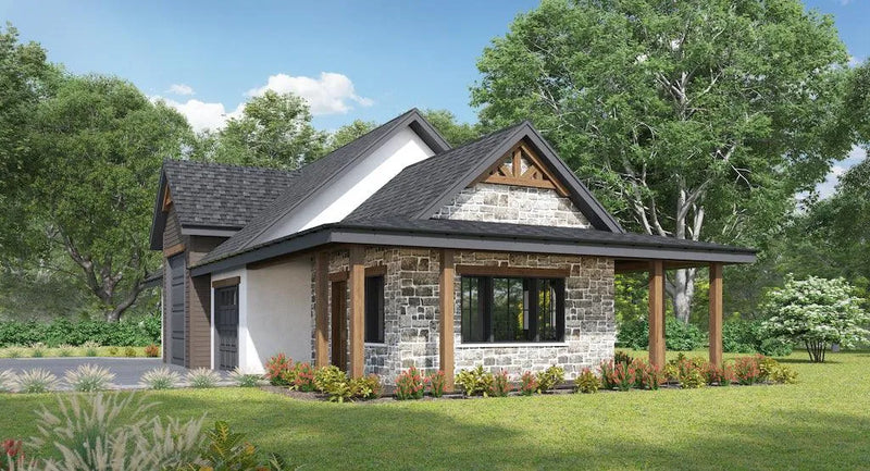 Discover this practical garage apartment featuring 324 sq. ft. of heated living space, ideal for a home office or study. The design includes a well-equipped workshop and a charming wraparound porch for relaxation and outdoor enjoyment.