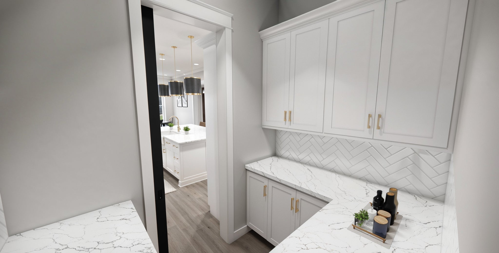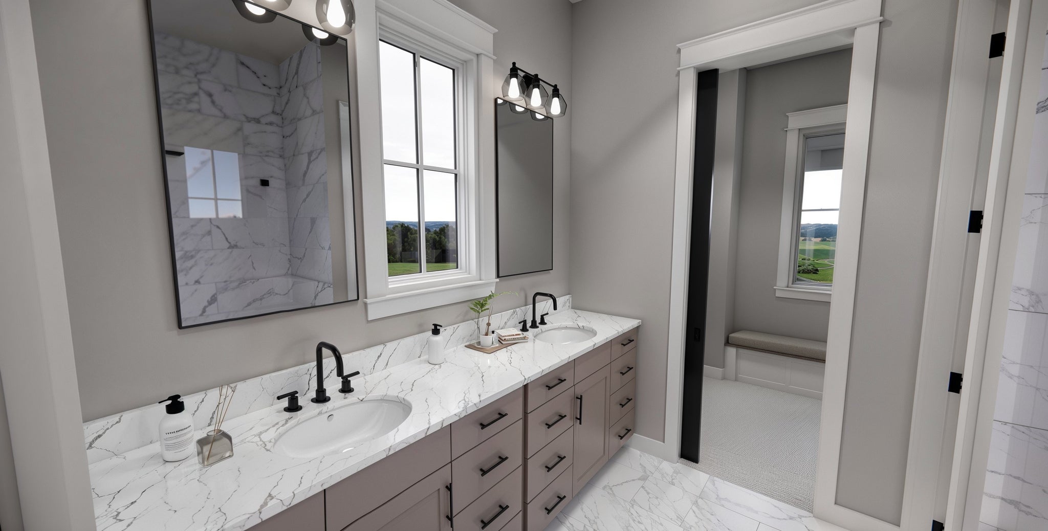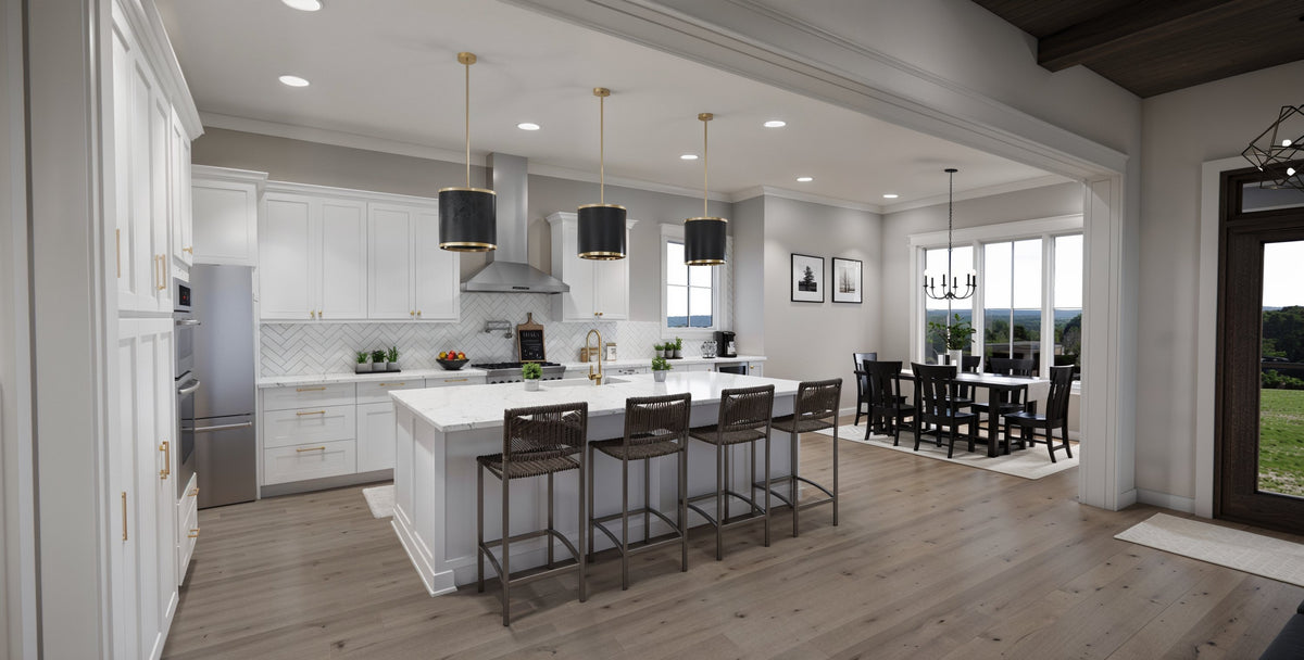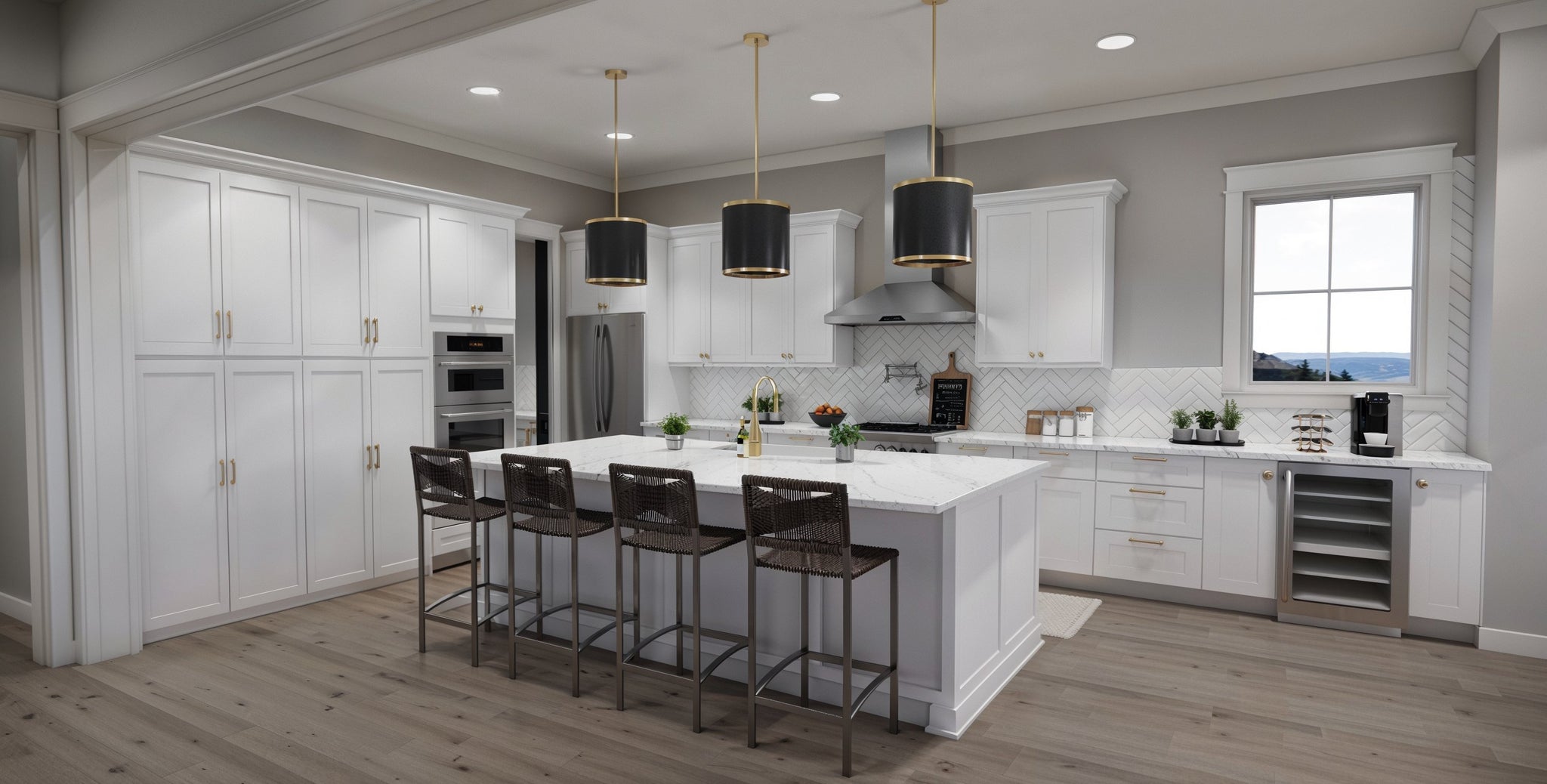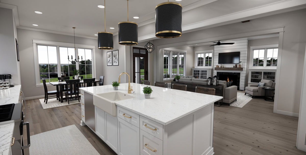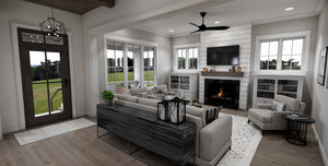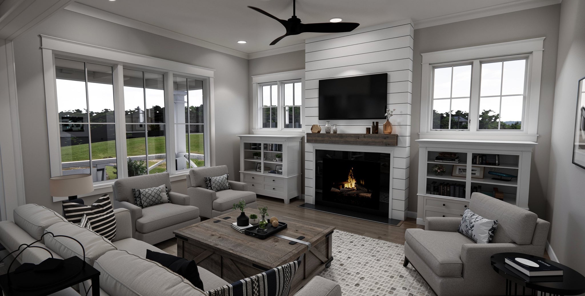 This inviting 3-bedroom, 3.5-bathroom farmhouse combines modern comfort with timeless charm across 2,454 square feet of living space. The spacious main level features an open floor plan where the great room welcomes you with a cozy fireplace and large windows, creating a bright and welcoming ambiance. The adjoining kitchen is designed for both cooking and entertaining, with a central island that seats four, plenty of cabinetry, and a walk-in pantry tucked behind a pocket door for easy access.