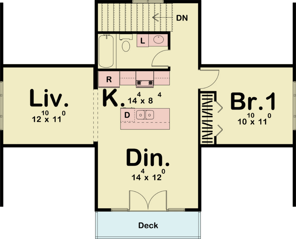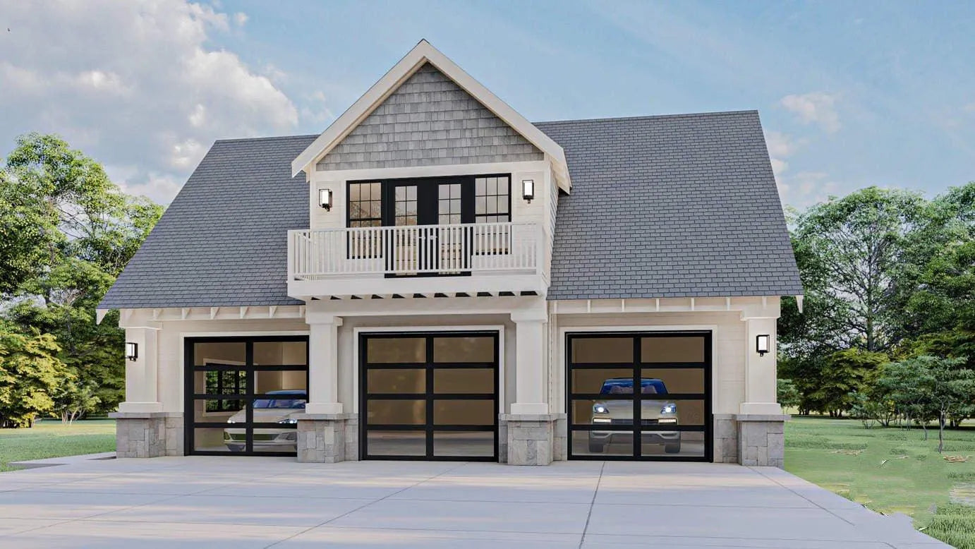 Introducing this compact yet versatile garage apartment plan, offering an ideal blend of style and efficiency within its 765-square-foot living space. The second-floor suite features a spacious 1-bedroom layout with an open floor plan, where the kitchen shines with a central island and eating bar, perfect for casual meals or entertaining guests. The living area seamlessly flows onto a cozy deck, extending your living space outdoors for relaxation or al fresco dining.