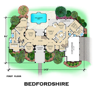 The second floor contributes an additional 2,840 sq ft, hosting secondary bedrooms—including a Jack and Jill bath setup—and a dedicated media room for immersive entertainment. Outdoor living is equally impressive with 1,316 sq ft of covered porches, both front and back, perfect for relaxing or entertaining. A 4-car side-load garage (1,214 sq ft) and thoughtful layout enhance everyday convenience, while the home office, keeping room, and breakfast area ensure flexible spaces for work and family life. Designed with 2x4 wall framing on a slab foundation, this home balances timeless elegance with modern functionality on a generous 143' wide by 81' deep footprint.