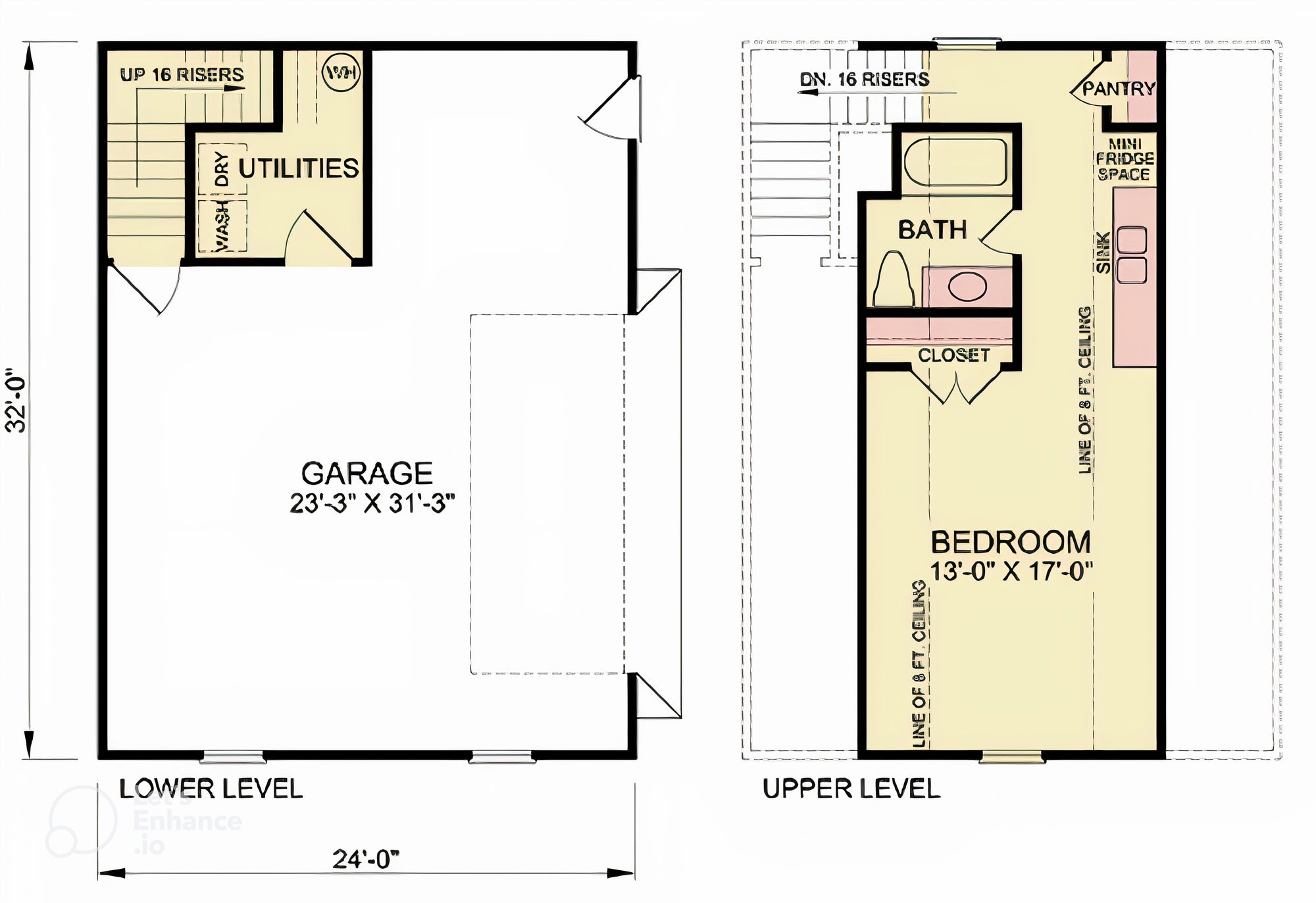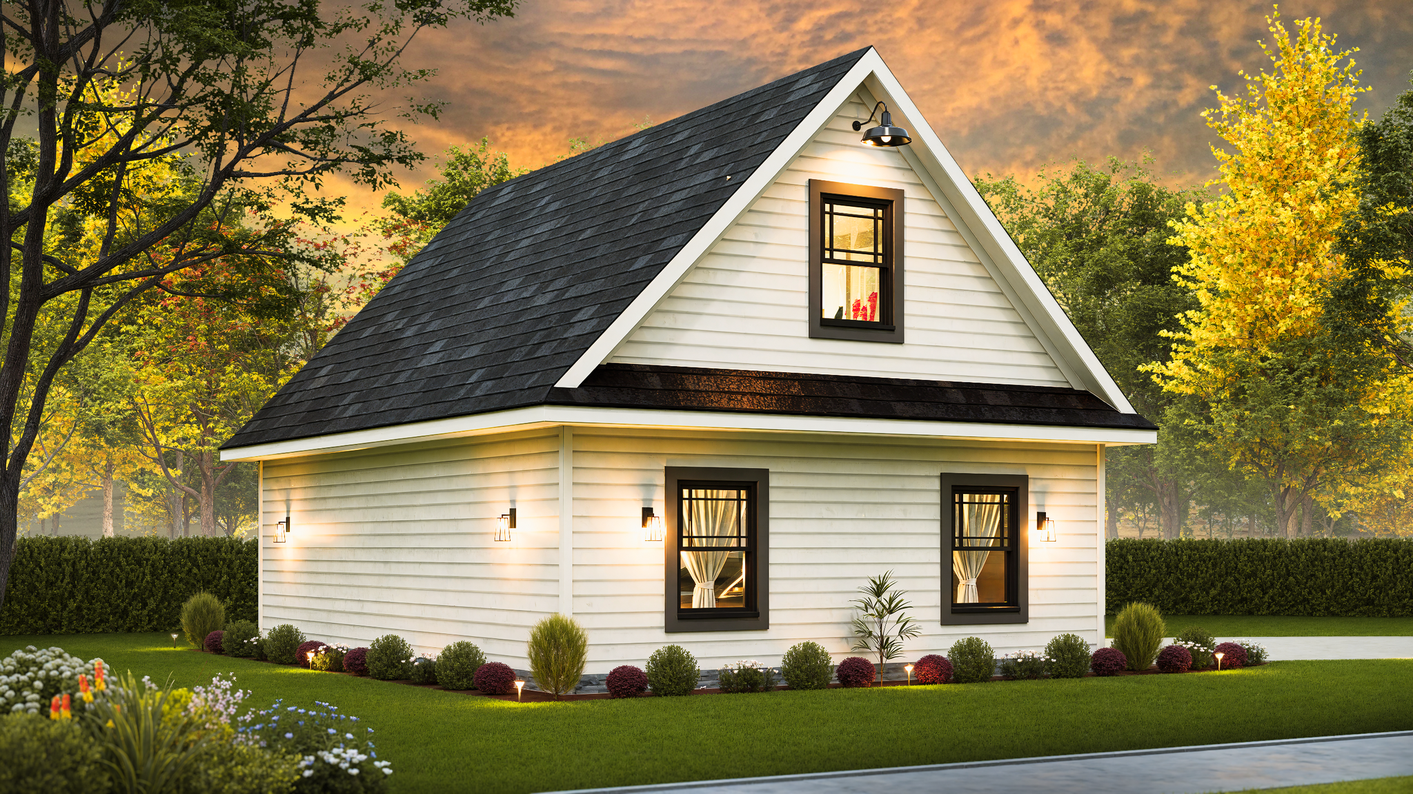 Perfect as a guest suite, rental unit, or private retreat, this stylish garage apartment offers 480 sq ft of heated living space perched above a spacious 645 sq ft two-car garage with an integrated 64 sq ft utility/workshop area. With a classic 12:12 roof pitch, stick-framed construction, and a compact 24' by 32' footprint, this two-story design is ideal for narrow lots, backyards, or investment properties.