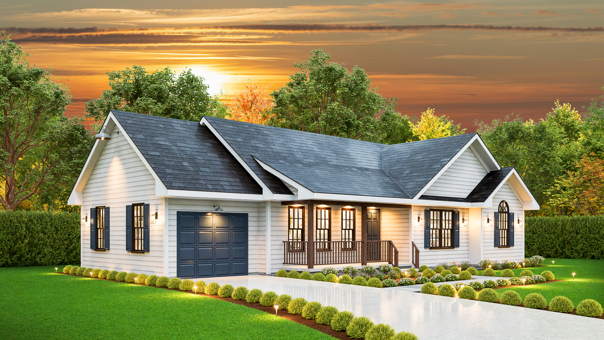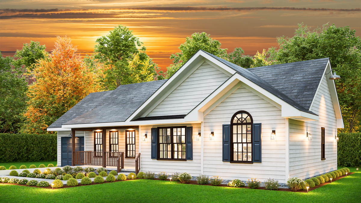 The inviting family room flows easily into the kitchen and dining areas, while a dedicated first-floor laundry and walk-in closets add everyday convenience. With a compact footprint of 58'4" wide by 39' deep and a 1-car front-load garage (264 sq ft), this home is well-suited for a variety of lot sizes. The farmhouse style, 9:12 pitched roof, and charming exterior siding complete the picture of simple, timeless living.