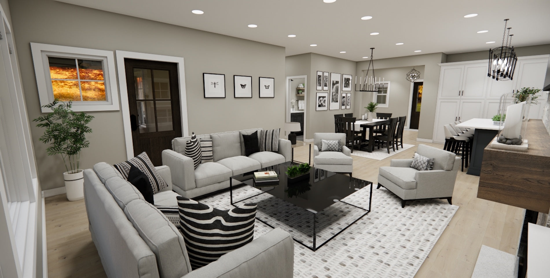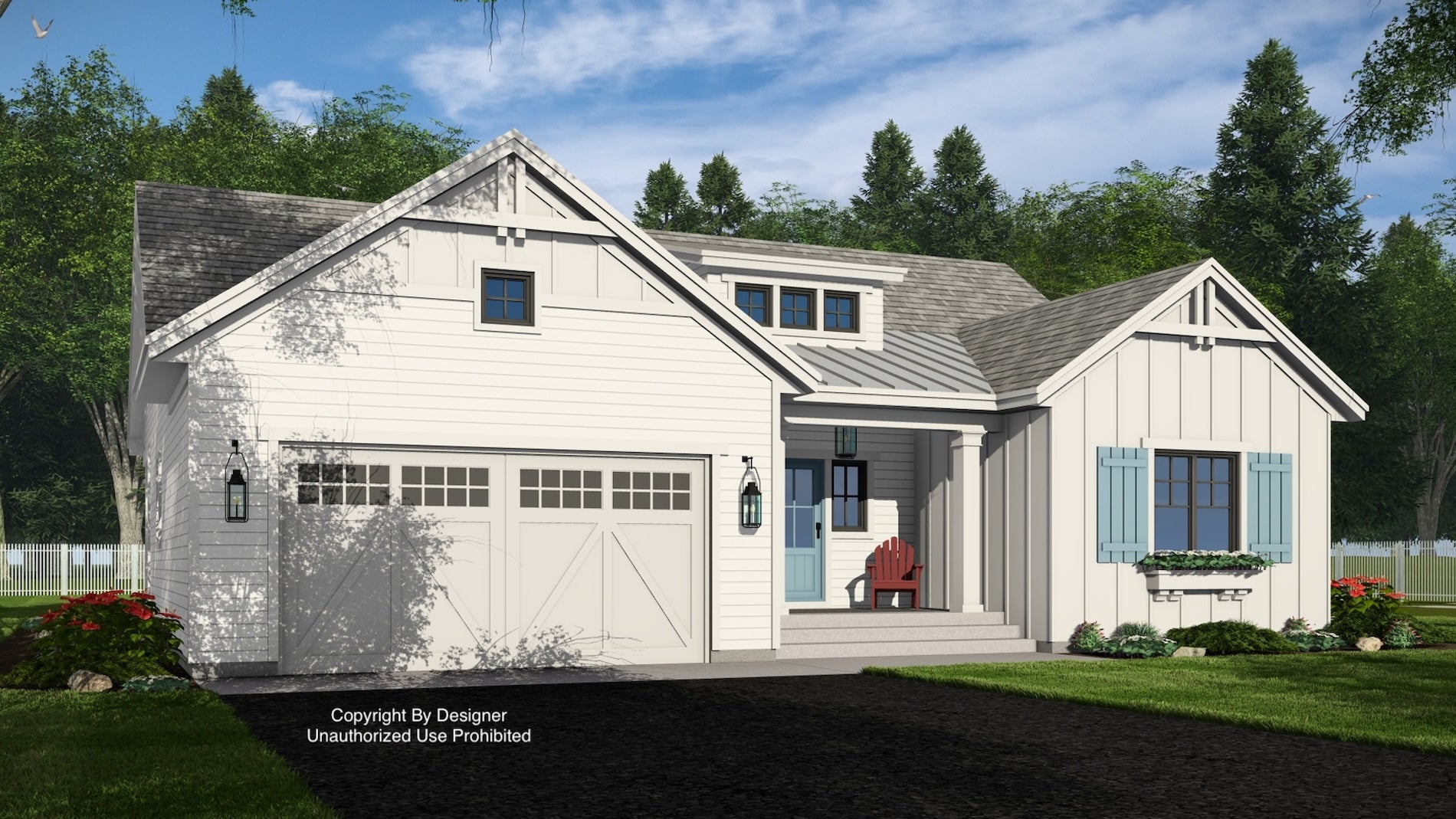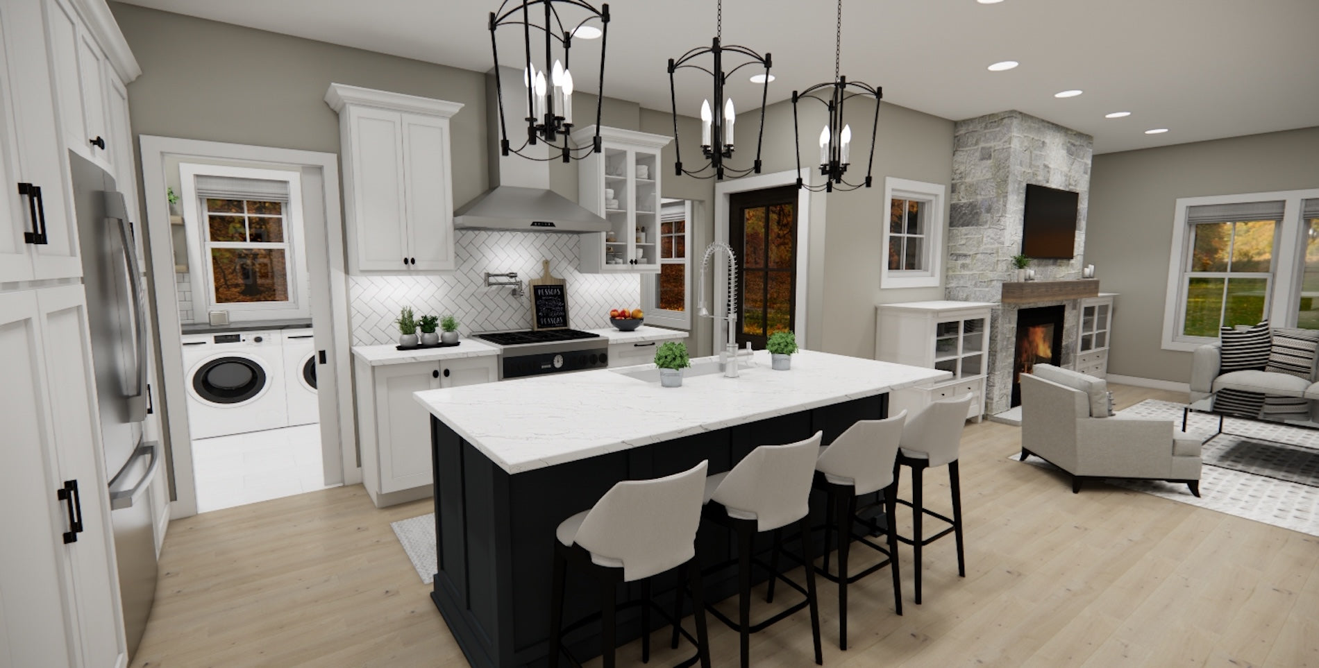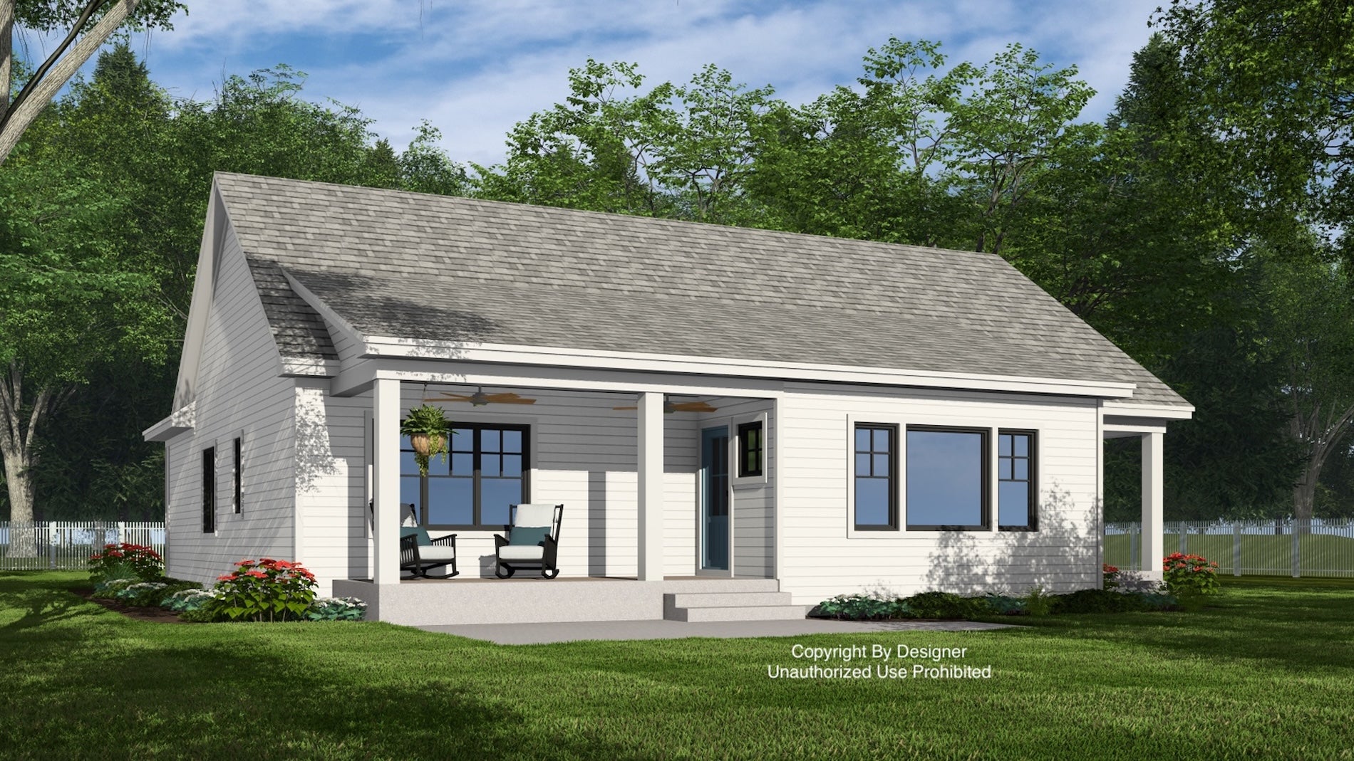 This 1,701 sq ft modern farmhouse blends rustic charm with smart, efficient design. A wide covered front porch welcomes you into an open floor plan where the great room, kitchen, and breakfast area flow seamlessly together. The kitchen features a generous island, walk-in pantry, and an eating bar perfect for family gatherings. A dedicated mudroom and first-floor laundry add everyday convenience, while the covered rear porch and grilling terrace extend living outdoors.
