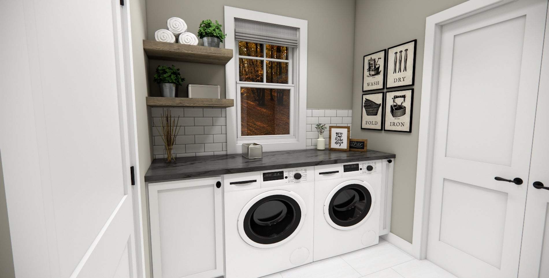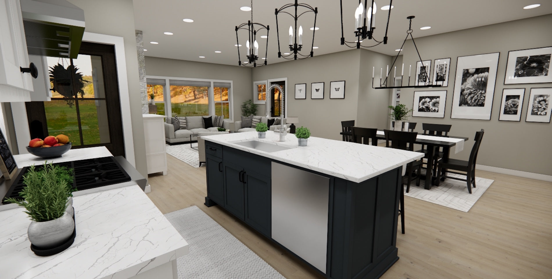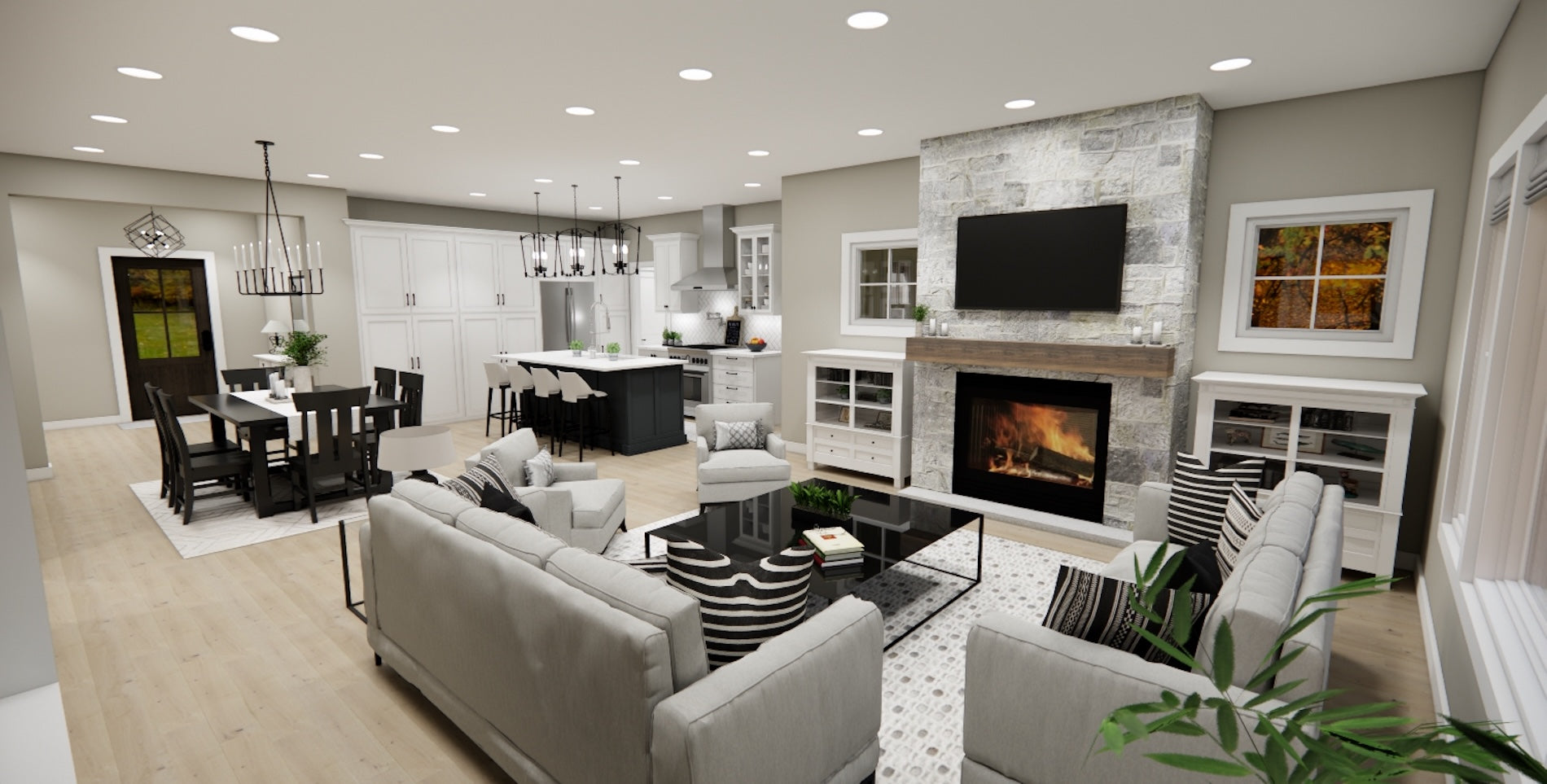 This 1,701 sq ft modern farmhouse blends rustic charm with smart, efficient design. A wide covered front porch welcomes you into an open floor plan where the great room, kitchen, and breakfast area flow seamlessly together. The kitchen features a generous island, walk-in pantry, and an eating bar perfect for family gatherings. A dedicated mudroom and first-floor laundry add everyday convenience, while the covered rear porch and grilling terrace extend living outdoors.