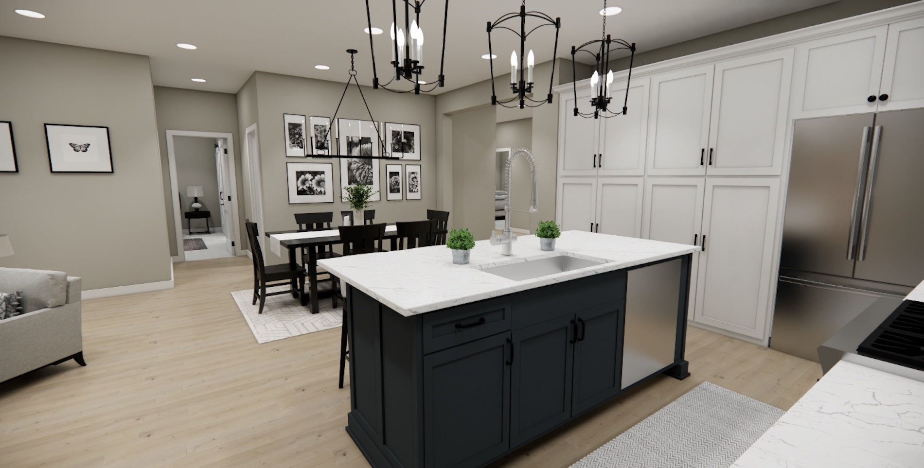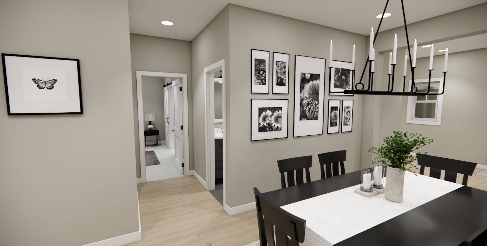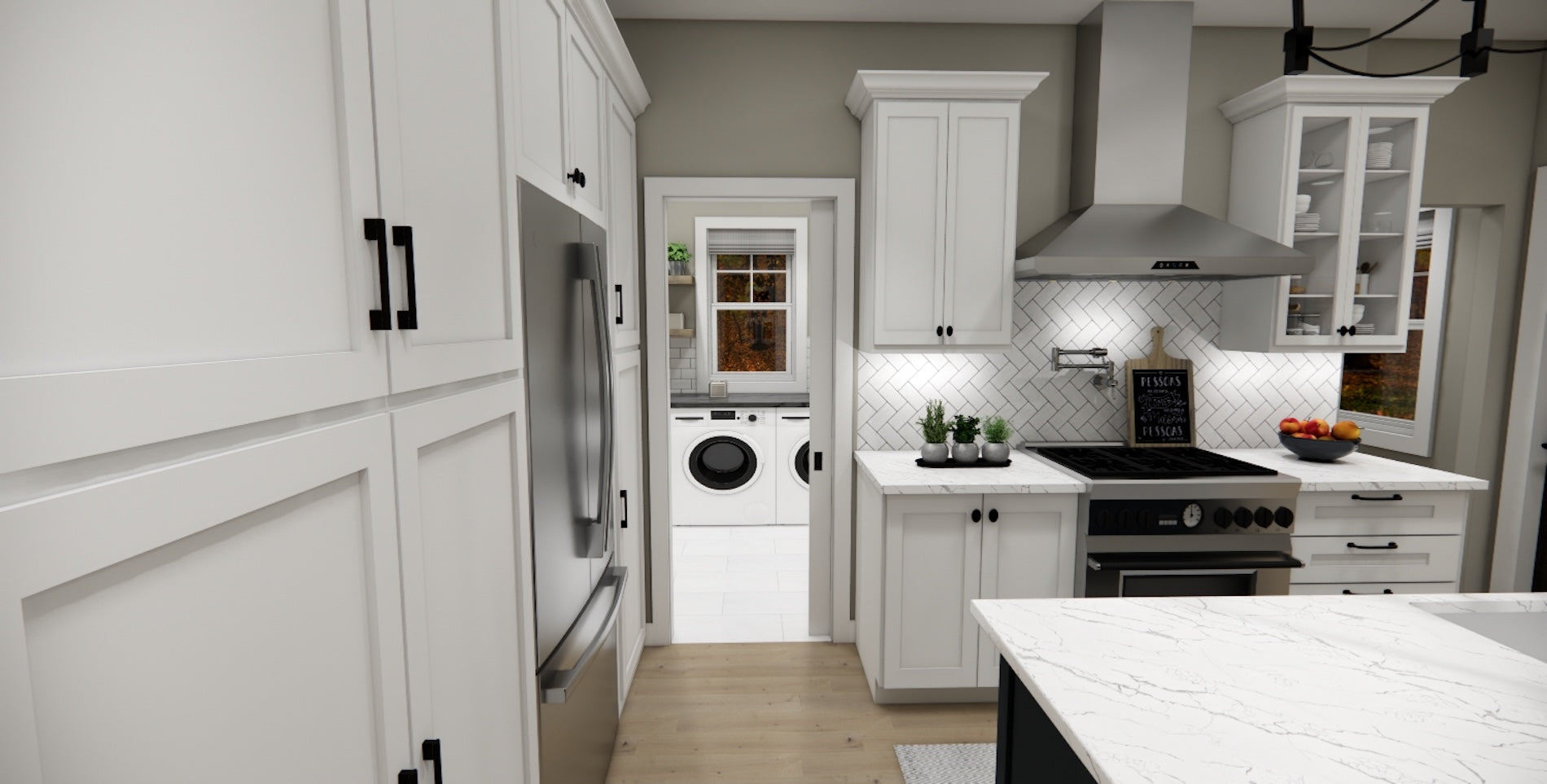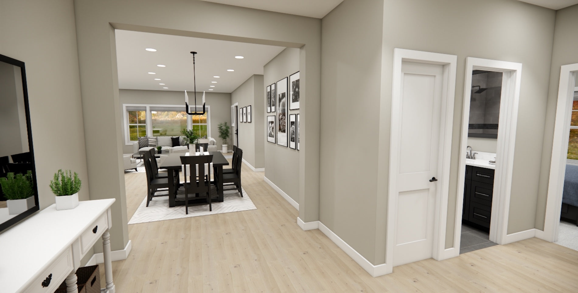 This 1,701 sq ft modern farmhouse blends rustic charm with smart, efficient design. A wide covered front porch welcomes you into an open floor plan where the great room, kitchen, and breakfast area flow seamlessly together. The kitchen features a generous island, walk-in pantry, and an eating bar perfect for family gatherings. A dedicated mudroom and first-floor laundry add everyday convenience, while the covered rear porch and grilling terrace extend living outdoors.