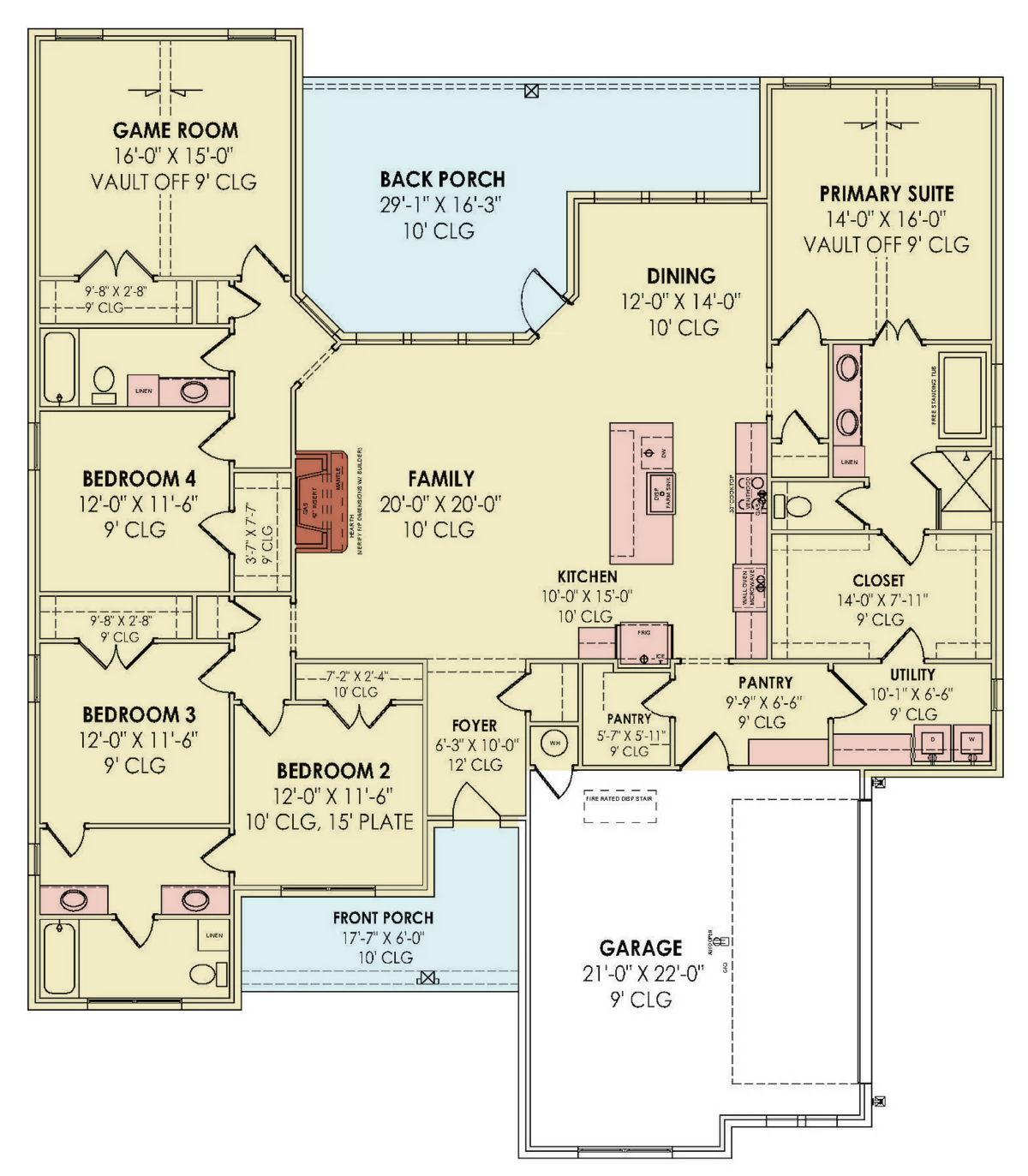 Welcome to this one-story house plan spans 2,646 sq ft of well-designed living space, combining elegance and practicality. The open floor plan features 10-foot ceilings, enhancing the spacious feel of the main living areas. Four bedrooms and three bathrooms ensure comfort and privacy, with a split-bedroom layout separating the owner's suite for added tranquility. The owner's suite also features direct laundry access, simplifying daily routines. The kitchen includes a walk-in pantry, while a connected mudroom and laundry area add functionality and storage.