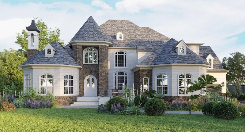 This stunning house plan features a total heated living area of 4,944 sq ft, designed for luxurious family living and entertaining. The expansive first floor spans 3,440 sq ft and boasts a grand two-story foyer that welcomes you into a beautifully appointed great room with a cozy fireplace. The gourmet kitchen is equipped with a spacious island, an eating bar, and a butler's pantry, seamlessly connecting to a bright breakfast area and formal dining room—perfect for hosting gatherings. The first-floor owner's suite offers a private sanctuary, complete with his and hers closets, a master bath featuring a double vanity sink, and a sitting area for relaxation. A convenient first-floor laundry, home office, and family room further enhance everyday living.