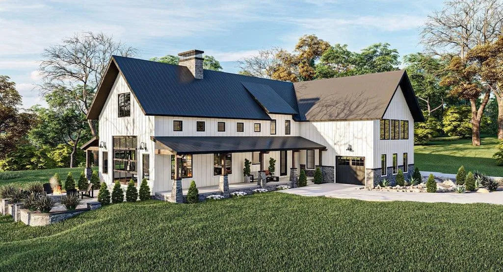 Welcome to this beautifully designed house plan encompasses a total heated living area of 3,371 sq ft, offering a perfect blend of comfort and functionality for modern living. The first floor spans 2,010 sq ft, featuring an open floor plan that includes a spacious great room with a cozy fireplace, perfect for family gatherings. The well-appointed kitchen boasts a large island and an eating bar, seamlessly connecting to a keeping/family room, ideal for casual entertaining. The first-floor owner's suite serves as a serene retreat, complete with a luxurious en-suite bathroom and walk-in closet. A convenient mudroom adds practicality, while the wraparound porch enhances outdoor living space.