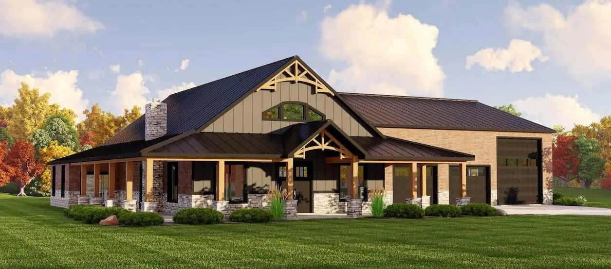 Designed for versatility, this home boasts a substantial 2,623 sq. ft. garage with three front-load bays and a dedicated workshop space, perfect for vehicle storage and projects. Outdoor living is maximized with 1,081 sq. ft. of porches, offering expansive spaces for relaxation. Built on a slab foundation with 2x6 wall framing and truss roof framing, the house features an efficient roof pitch (9:12 and 4:12) and spans 96 feet in width by 75 feet in depth. This plan is ideal for those seeking a blend of luxury, comfort, and ample workspace in a stylish, open environment.