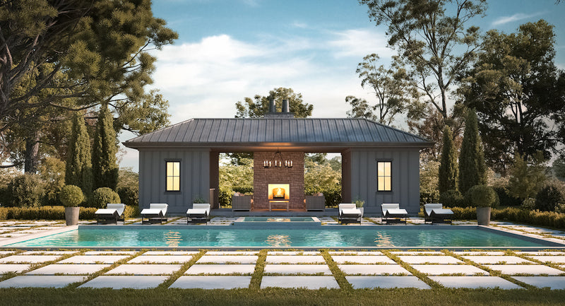 A standout feature of this plan is the expansive 251 sq. ft. lanai, perfect for outdoor relaxation and entertaining. The outdoor fireplace enhances the ambiance, making it an inviting space for gatherings in any season. With a sleek and functional design, this small yet stylish structure is perfect as a backyard addition, guest space, or recreational retreat.
