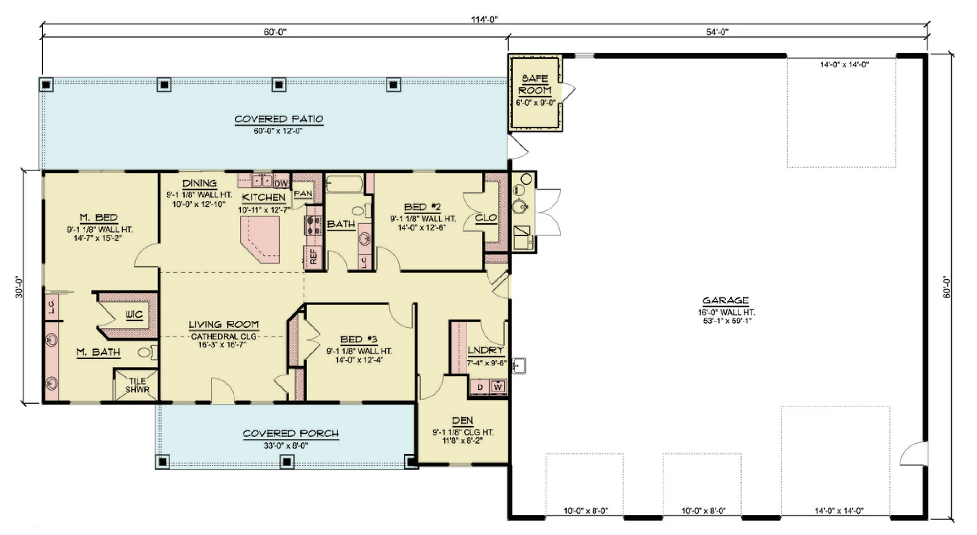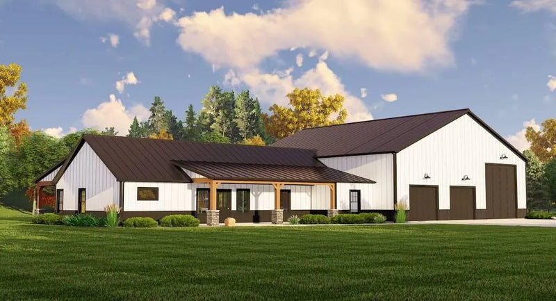 This stunning house plan boasts a generous total living area of 1,896 sq. ft., thoughtfully designed for comfort and functionality. The spacious first floor features an inviting open floor plan, perfect for family gatherings and entertaining. A stylish kitchen, complete with a walk-in pantry and an eating bar, seamlessly flows into the great room, where vaulted ceilings enhance the airy atmosphere. The first-floor owner's suite provides a tranquil retreat, featuring a master bath with a double vanity sink and a walk-in closet. Additional highlights include a dedicated home office/study, a convenient first-floor laundry, and a mudroom for easy organization. Outdoor living is just as inviting, with a covered front porch and a rear porch perfect for relaxing. With three bedrooms and two bathrooms, this home offers ample space for family living. The expansive 3,240 sq. ft. garage with four bays ensures plenty of room for vehicles and storage needs.