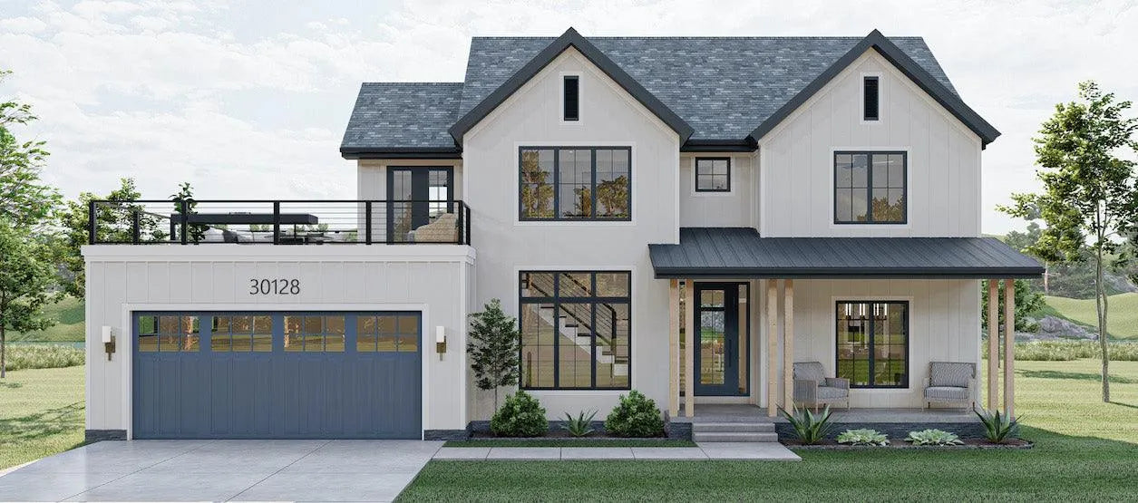 The gorgeous Cartwright plan is a beautiful modern farmhouse style house plan. The stunning exterior combines board and batten siding and wood accents with the party deck above the garage for an amazing curb appeal.