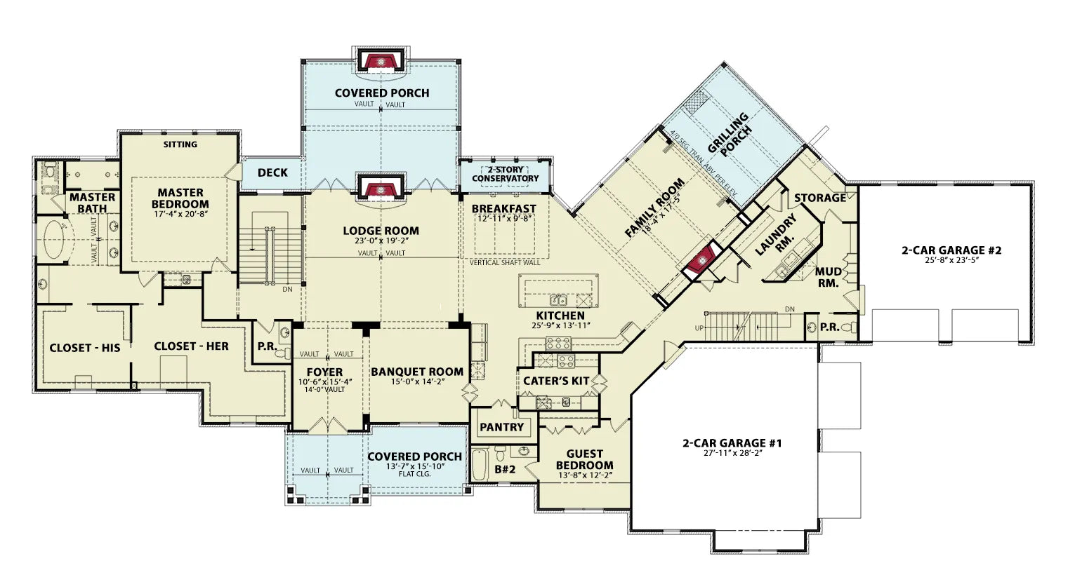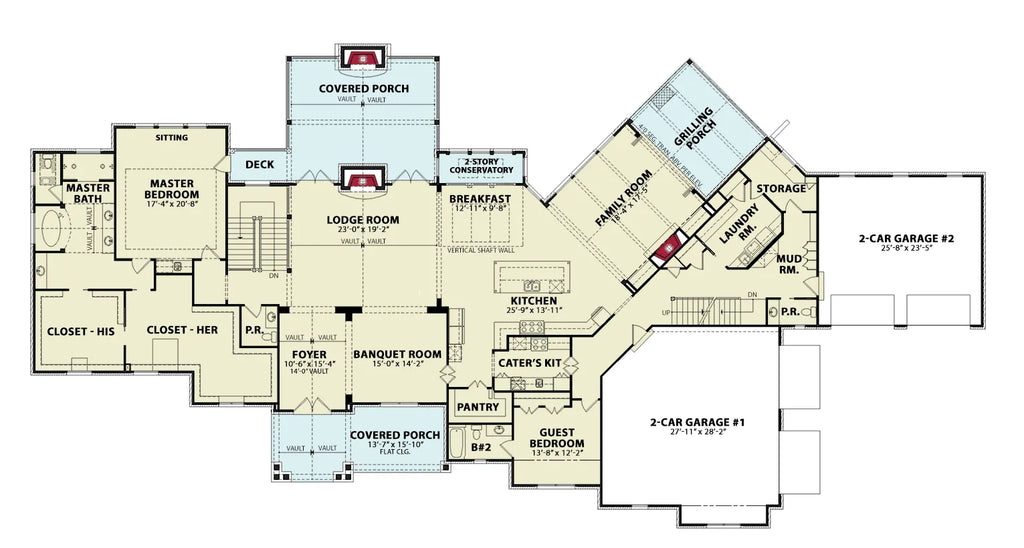 The overall layout of this house plan consists of multiple bedrooms, bathrooms, a spacious kitchen, a dining area, and a living room or great room for entertaining guests. It also incorporated practical elements such as two 2-car garage, a laundry room, and ample storage space.
