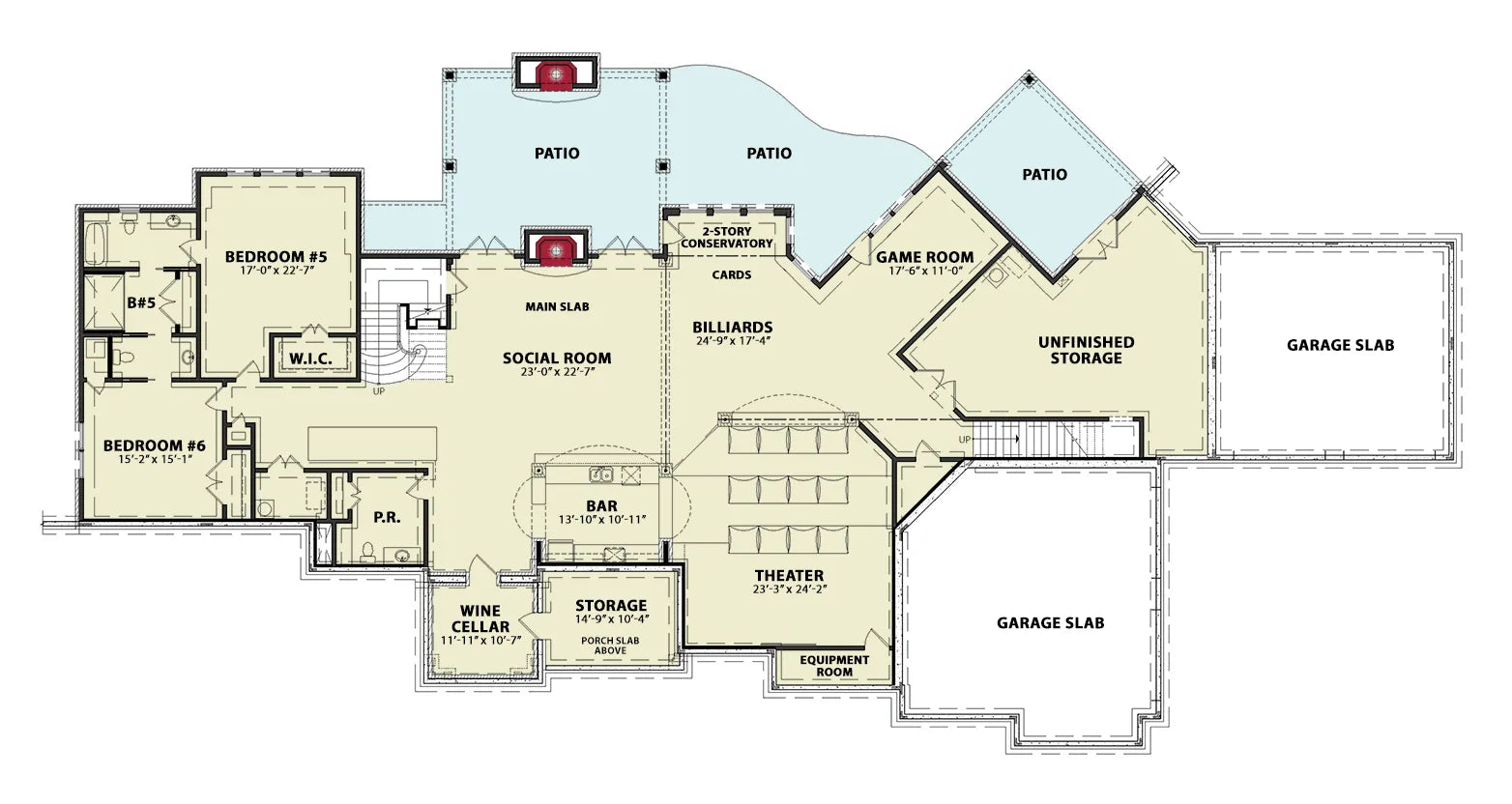 The plan showcases an open floor plans, large windows, and sliding glass doors to maximize natural light and provide seamless indoor-outdoor transitions. Additionally, it includes features such as covered porch, and barbecue area.