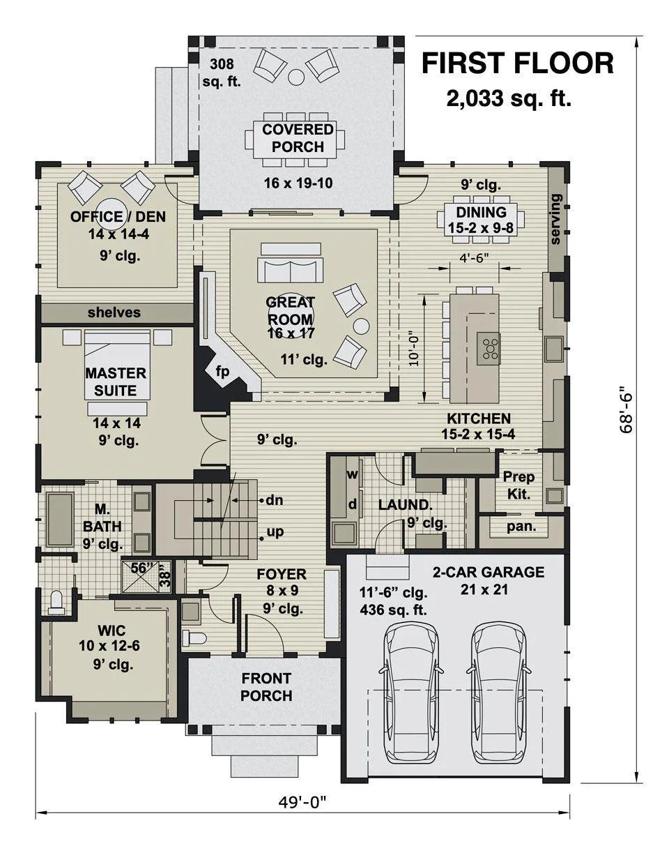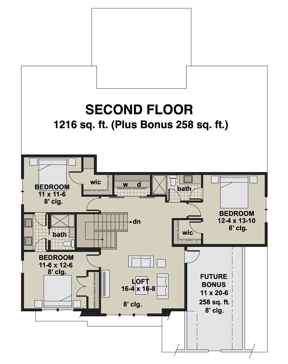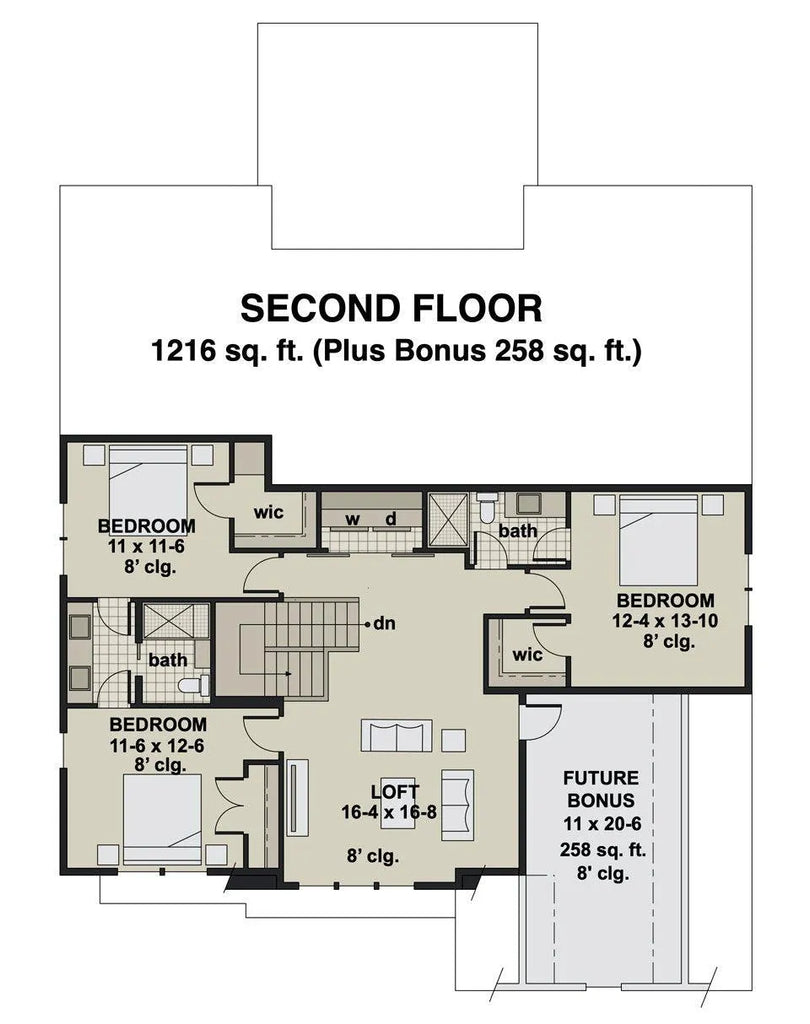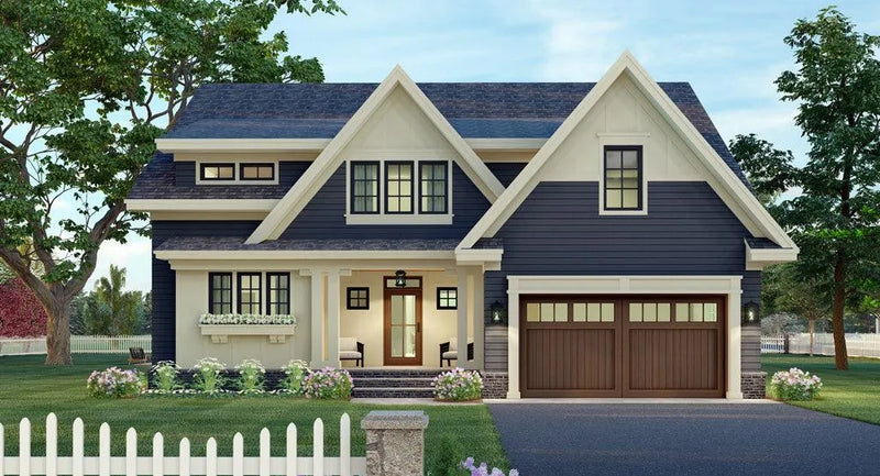 The front & rear covered porches give this house many options for relaxing and enjoying the outdoors. There are also options for the garage space. You can order this plans with 2 garage bays or 3. And you can have those bays either front load, or side load. This makes fitting this home on your lot very easy.