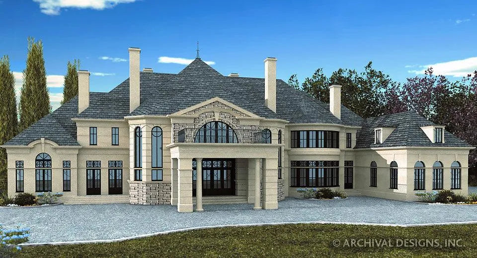 The upper level of this estate house plan you will find four Bedrooms and Baths, Balconies, Porches and a Bonus Room. The basement has a sixth Bedroom including Bath and Sauna. The basement also consists of a Gym, access to the Porches, Game Room, Recreation Area, Snack Bar, Media Room/Theater and a Wine Cellar. This home has it all, whether entertaining family or friends.
