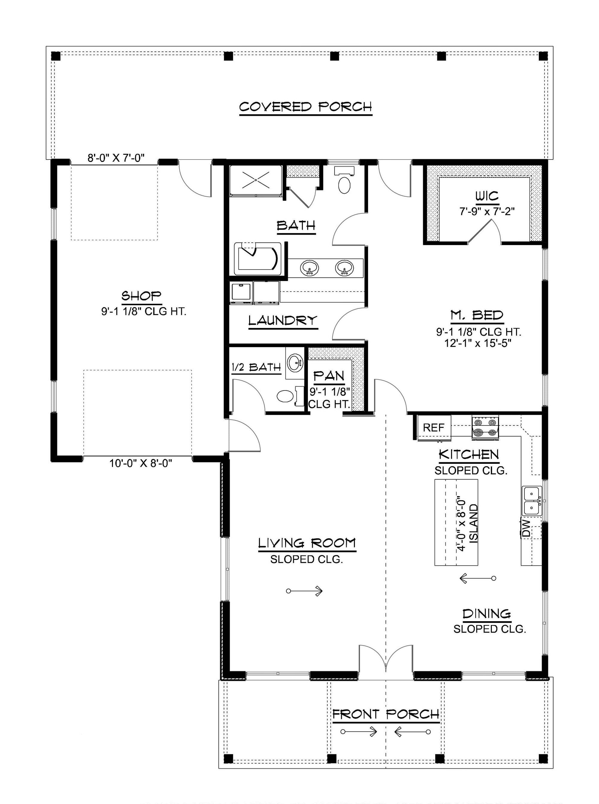 This charming country house plan is designed for simplicity and comfort, offering 1,440 square feet of heated living space. The layout features 1 bedroom and 1.5 bathrooms, making it ideal for individuals, couples, or those seeking a cozy retreat. The home also includes a 448-square-foot, 1-car garage, perfect for parking or additional storage.