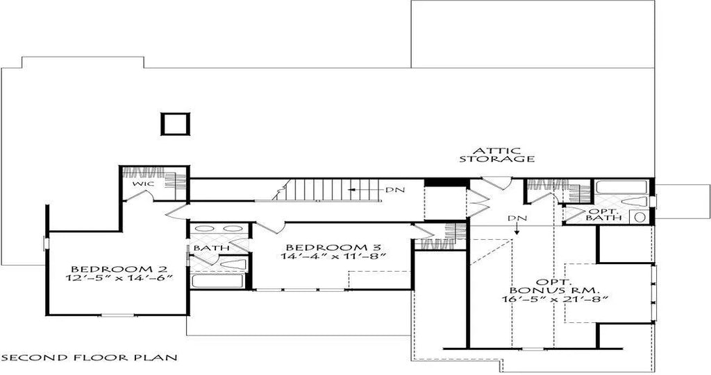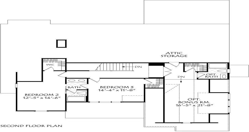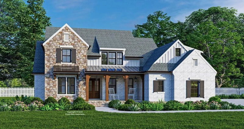 A great place for conversation and rest is the classic front porch. The porch provides protection from the elements as well as defines the entry point. The Colchester Farmhouse features exactly the kind of porch everyone desires. The use of fieldstone, painted brick, and vertical siding as the materials of choice blend masterfully to present a charming elevation. Dark accents on the window sashes and the timber elements complete the design. The main floor is bright and airy with large window groupings and a wide sliding door. The open-concept design features a kitchen, dining, and living area that is one huge integrated space. The owner's suite is on the main level as well as a flexible space that can be a guest bedroom or work-from-home center. A convenient side entry from the driveway is perfectly situated for the organization and elimination of clutter. The upper level contains two additional sleeping rooms along with an optional bonus room. The bonus room could add a fifth bedroom if the bath and closet are finished along with the remainder of the space.