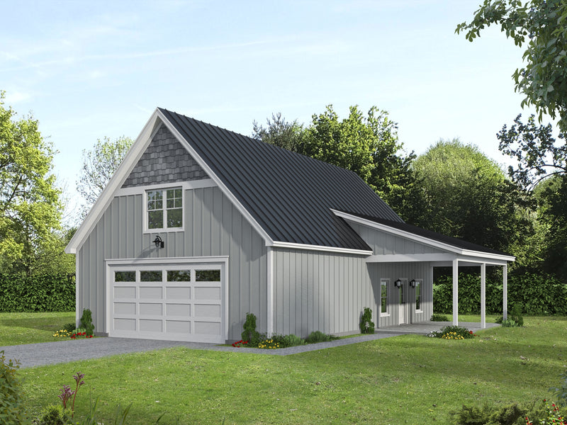 This practical ADU-style house plan combines functionality and comfort with a massive four-bay garage on the main level and a fully private living space above. The first floor features 1,433 sq. ft. of garage space, perfect for car collectors, workshop needs, recreational vehicles, or storage. A convenient half bath enhances the main level, adding practicality for anyone using the garage or working on projects.
