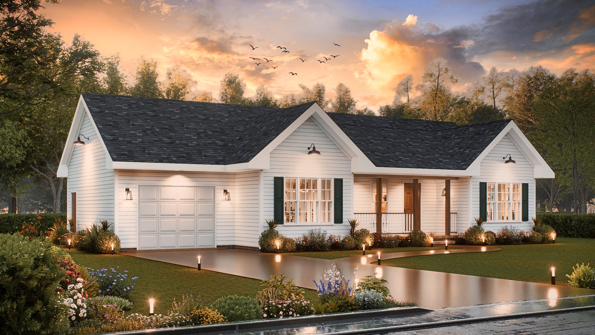 This charming 1,101 sq ft one-story home offers a functional layout with everything you need for comfortable living. Featuring three bedrooms and two full bathrooms, the design includes a private first-floor master suite and a spacious walk-in pantry off the kitchenβperfect for staying organized and efficient. With 8-foot ceilings and a stick-framed 8:12 pitch roof, the home feels open while maintaining a cozy, grounded feel.