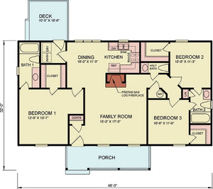Step into the open-concept keeping/family room, where a warm fireplace and vaulted ceiling create an inviting space to relax or entertain. The kitchen flows seamlessly to the dining area and features easy access to both a welcoming covered front porch and a rear deck—perfect for morning coffee or evening get-togethers. With additional features like a convenient first-floor laundry, crawl space foundation, and classic stick-framed construction, this home blends traditional style with everyday comfort in a compact, elegant footprint. Whether you're building a cabin getaway or a forever home, this plan checks all the boxes.