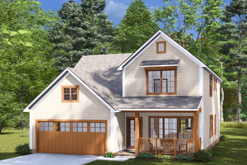 This 2-story cottage-style home is thoughtfully designed for narrow lots, offering 1,994 square feet of living space with a balance of comfort and efficiency. The main floor, with 1,275 square feet, includes a first-floor master suite featuring a double-vanity master bath and a spacious walk-in closet. The open-concept kitchen includes a central island and a walk-in pantry, while a mudroom provides direct access to the 418-square-foot, front-load, two-car garage.