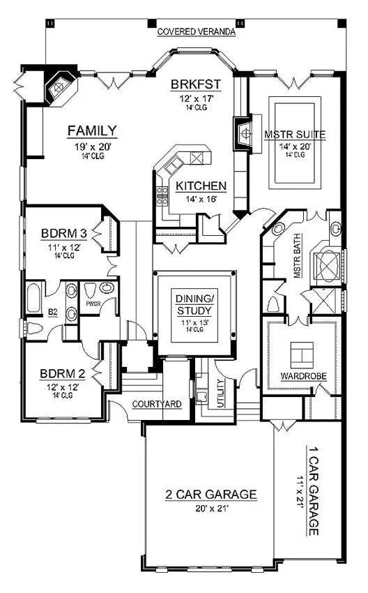 Adjacent to the kitchen is the elegant dining room with 14' trey ceiling and large, decorative columns that define the perimeter of the room. The master suite is on the right side of the house plan and boasts French doors that lead out to the covered veranda, a trey ceiling, and a fireplace. French doors lead to the luxurious master bath, complete with his and hers vanities, separate glass shower, tile a step-up garden tub, and large wardrobe with built-ins. Inside the wardrobe, there is a small storage room. A utility room and two garages, a two-car, courtyard-entry and one-car, front entry garage complete this classic traditional home plan.