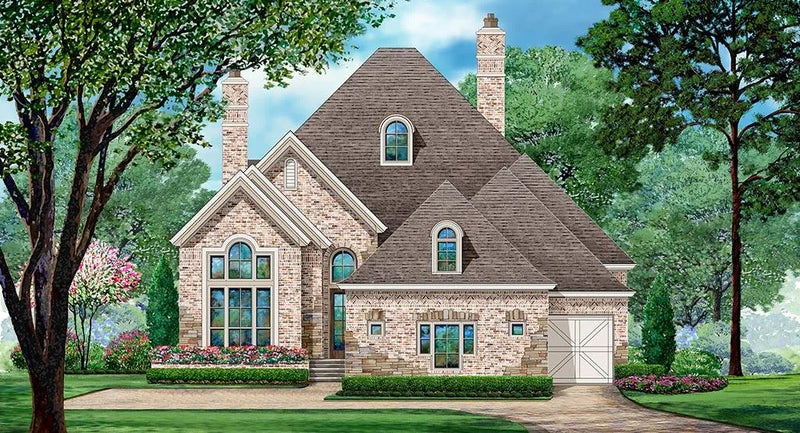 This classical traditional home plan offers luxury on one level, perfect for a narrow lot line or zero lot line. It has traditional arched windows and dormers, and a covered two-story entry with transom. Walking the courtyard into the front entry, you will find yourselves in this split bedroom plan. Two family bedrooms are directly to the left, each with a walk-in closet. They share a Jack-n-Jill bathroom. Beyond is the large open family room with built-ins, a dramatic fireplace, and French doors onto the covered veranda. The breakfast room and gourmet kitchen are open to the family room, seamlessly separated by the kitchen's curved breakfast bar. Other kitchen features are modern, state-of-the-art appliances, built-ins, pendant, and recessed lighting, and a pantry.