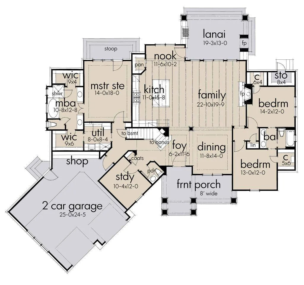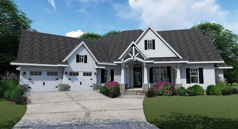 Tapered columns and attractive gables give the Crystal Pines a craftsman house plan feel. This beautiful home boasts three bedrooms, 2.5 baths, and ample space to entertain friends. You will be amazed at the bright and spacious family room in this farmhouse home plan, and the island kitchen, with a shared 12-ft. ceiling. A fireplace adds warmth, and a lanai expands your party, with a second fireplace and a summer kitchen. Meals may be taken in the formal dining room or the casual breakfast nook.