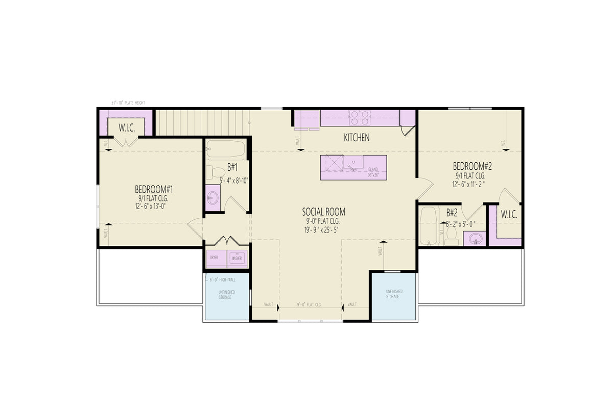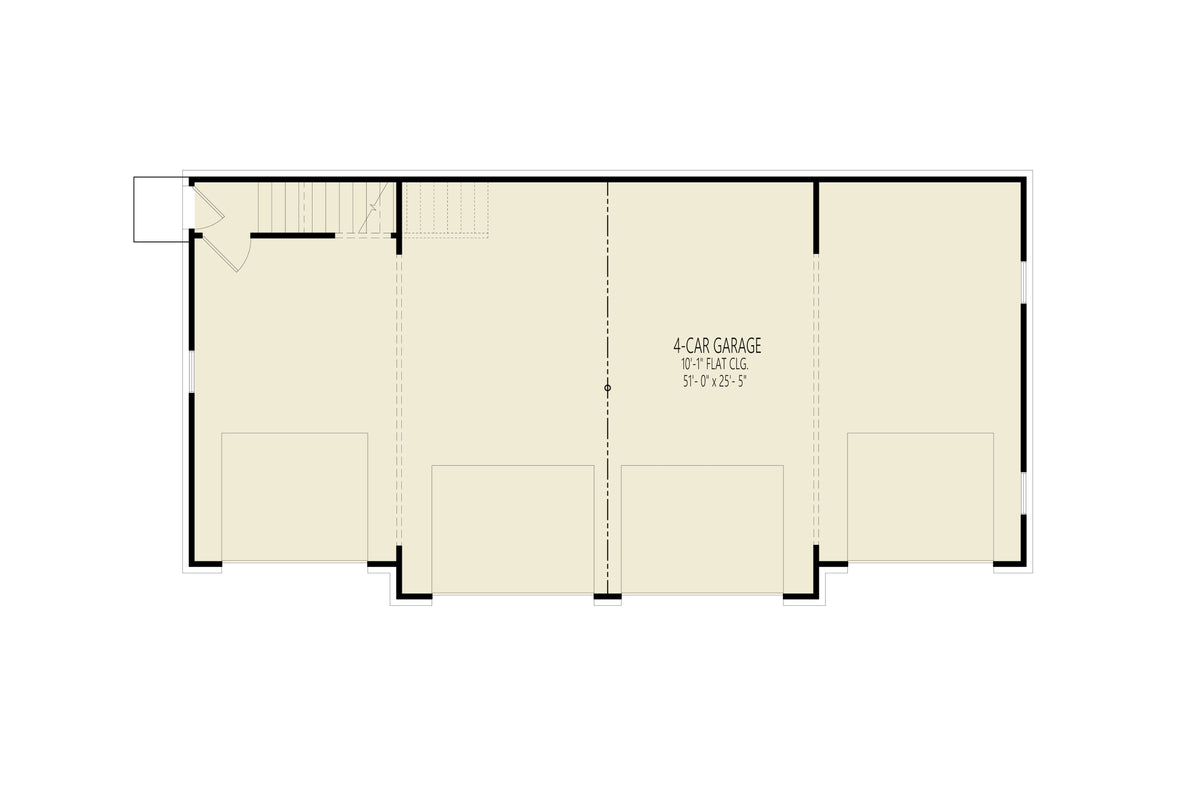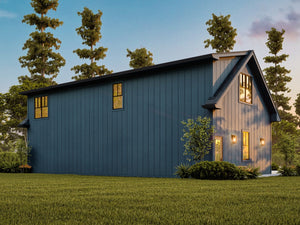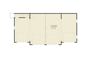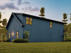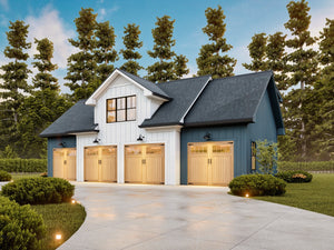 The Daphne garage apartment plan combines functionality and style, featuring a spacious 1,241 sq ft garage with four bays, ideal for car enthusiasts or those needing extra storage. The garage load is positioned at the front, providing easy access while maintaining a sleek exterior. Above the garage, the 1,056 sq ft living space offers a modern, open floor plan designed for comfort and convenience.