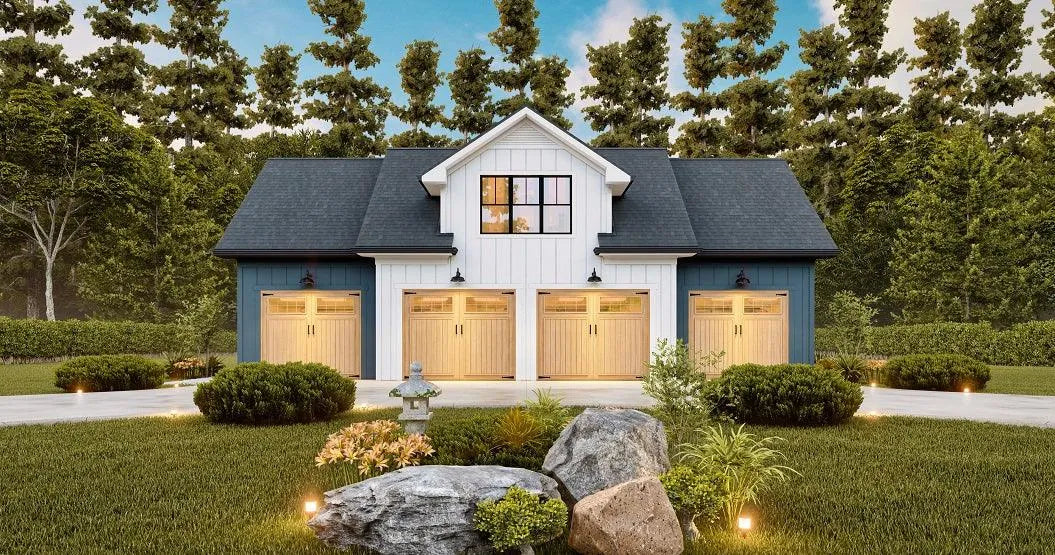 The Daphne garage apartment plan combines functionality and style, featuring a spacious 1,241 sq ft garage with four bays, ideal for car enthusiasts or those needing extra storage. The garage load is positioned at the front, providing easy access while maintaining a sleek exterior. Above the garage, the 1,056 sq ft living space offers a modern, open floor plan designed for comfort and convenience.