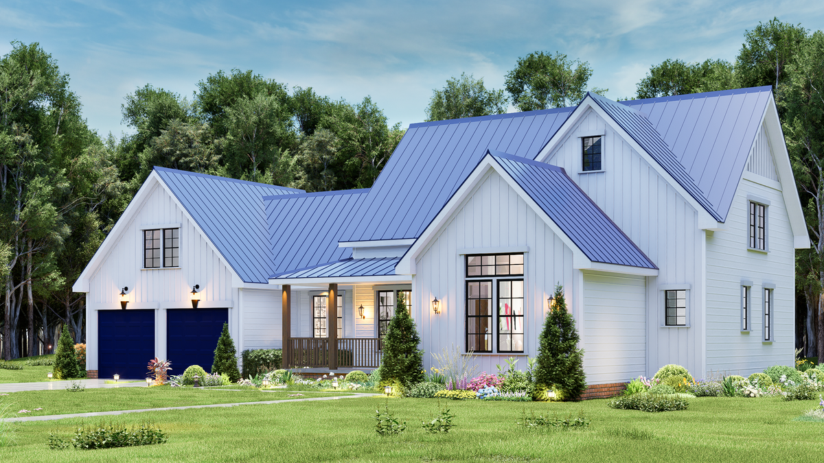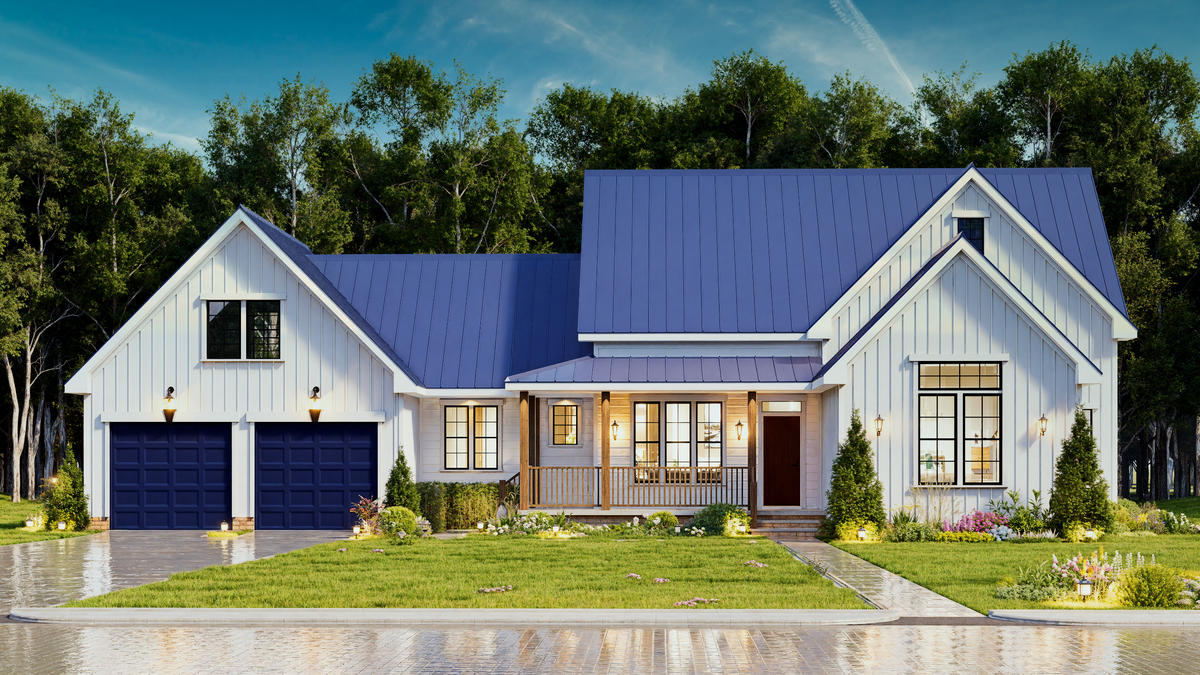 A covered front porch (169 sq. ft.) welcomes you in, while a large rear deck and 210 sq. ft. covered porch create seamless indoor-outdoor living. A bonus 347 sq. ft. unfinished rec room offers endless potential—home gym, office, or future guest suite. The 2-car front-load garage (576 sq. ft.) includes 9' x 8' doors and convenient access to the home. With durable 2x4 exterior framing, board and batten siding, and a classic 12:12 pitch metal roof, this farmhouse combines timeless curb appeal with practical, modern features to suit your lifestyle.
