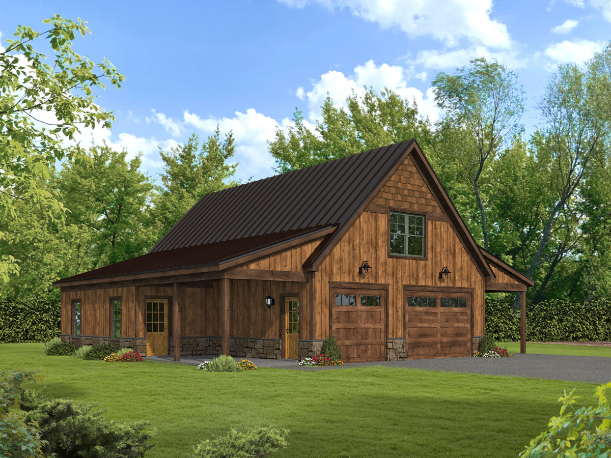 This unique and versatile garage apartment design offers 971 square feet of heated living space above a spacious 1,108 sq ft 3-car garage. Perfect for multi-use living, guest accommodations, or rental income, the layout includes 239 sq ft on the main level and 732 sq ft on the upper floor. A thoughtful mix of function and comfort, the design features a side porch for relaxed outdoor living and a dedicated workshop space ideal for hobbies or creative projects.
