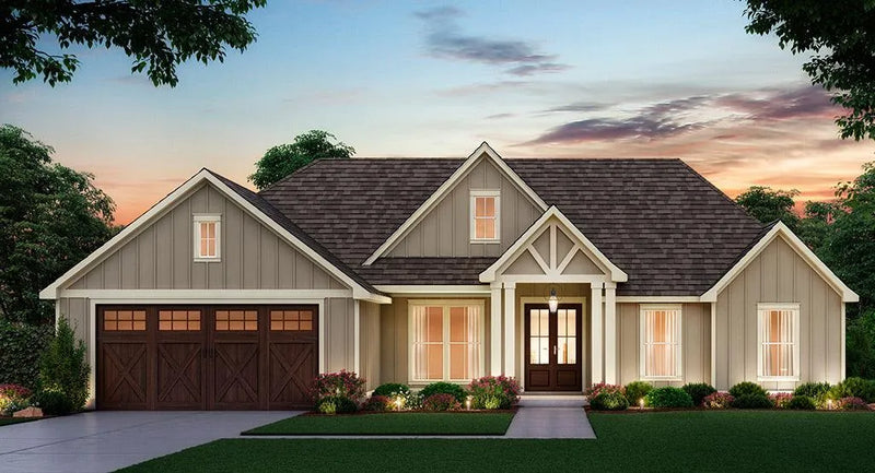 White beams contrast with warm tones and rustic wooden doors, inviting you into the delightful Deer Run Country house plan. A small, ingeniously designed one-story house plan for those who want a peaceful retreat with all the functionality of a larger house plan. With four bedrooms, two bathrooms plus a two-car front load garage, Deer Run's 1889 sq. ft. of total living space will surprise you with its range of features.