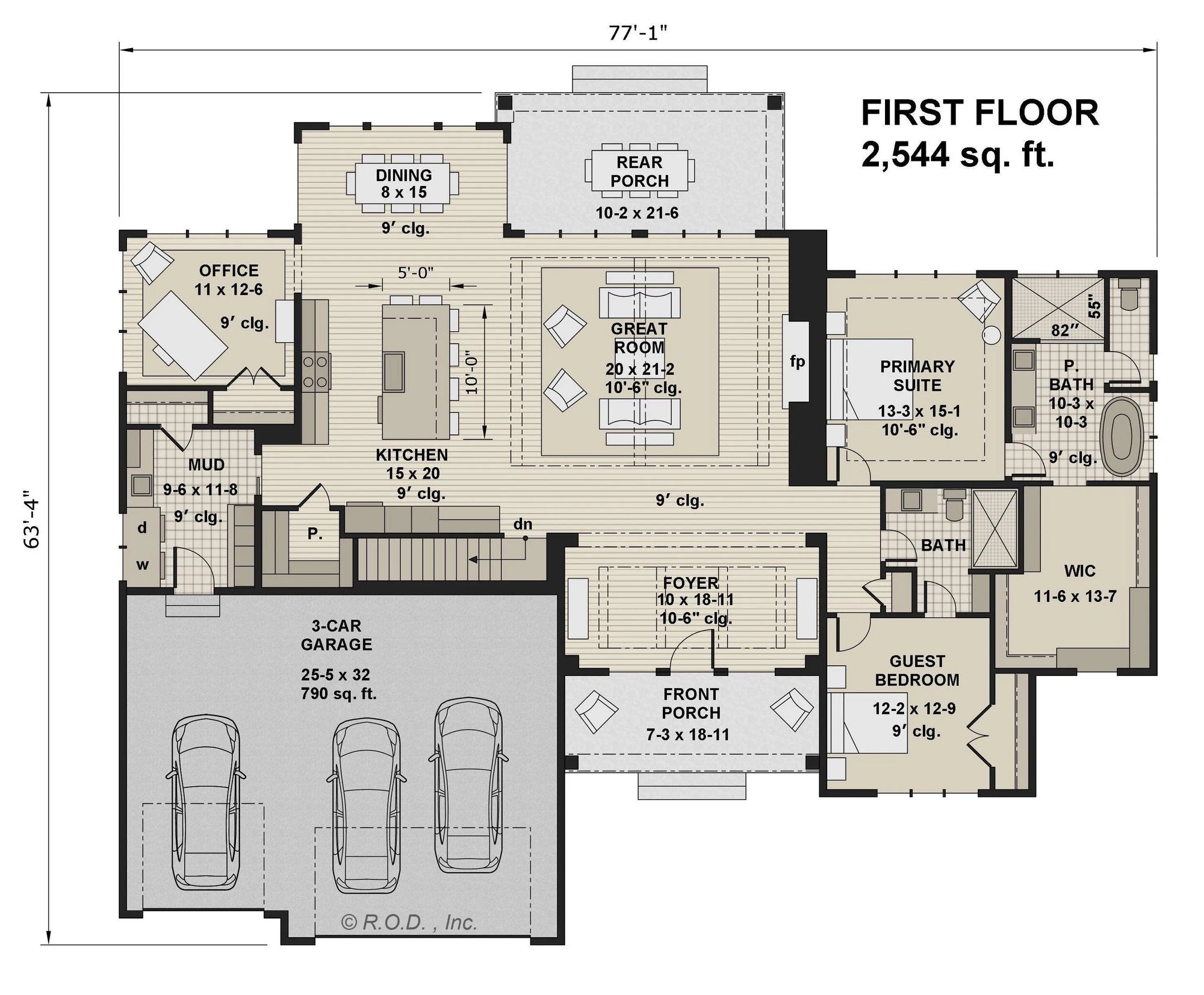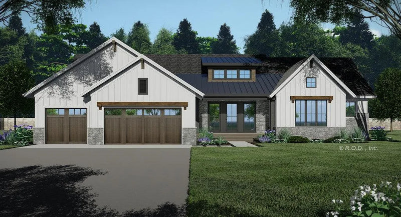 This traditional style house plan boasts a stunning exterior featuring a creative use of wood, stone and steel. With a spacious layout of 2544 sq ft, this house includes 2 bedrooms, 2 bathrooms and a 3-car garage.